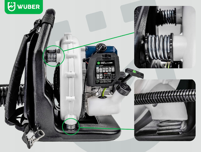 Двигатель устройства установлен на пружинах, которые поглощают вибрации и снижают их во время работы. Это делает конструкцию более прочной и снижает утомляемость пользователя.