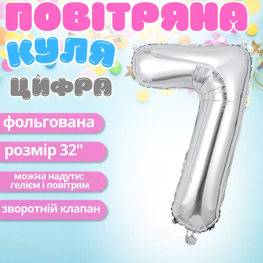 Фольгированный воздушный шар в форме цифры «7» серебристого цвета —