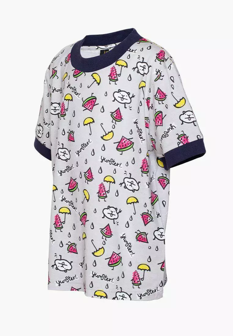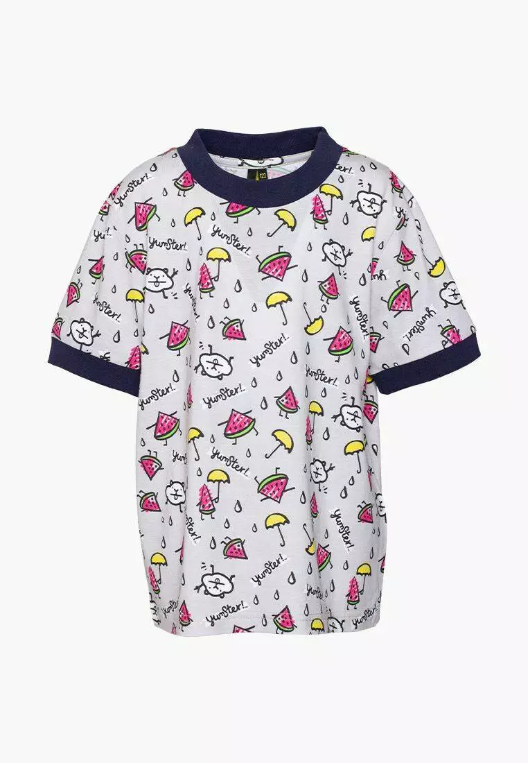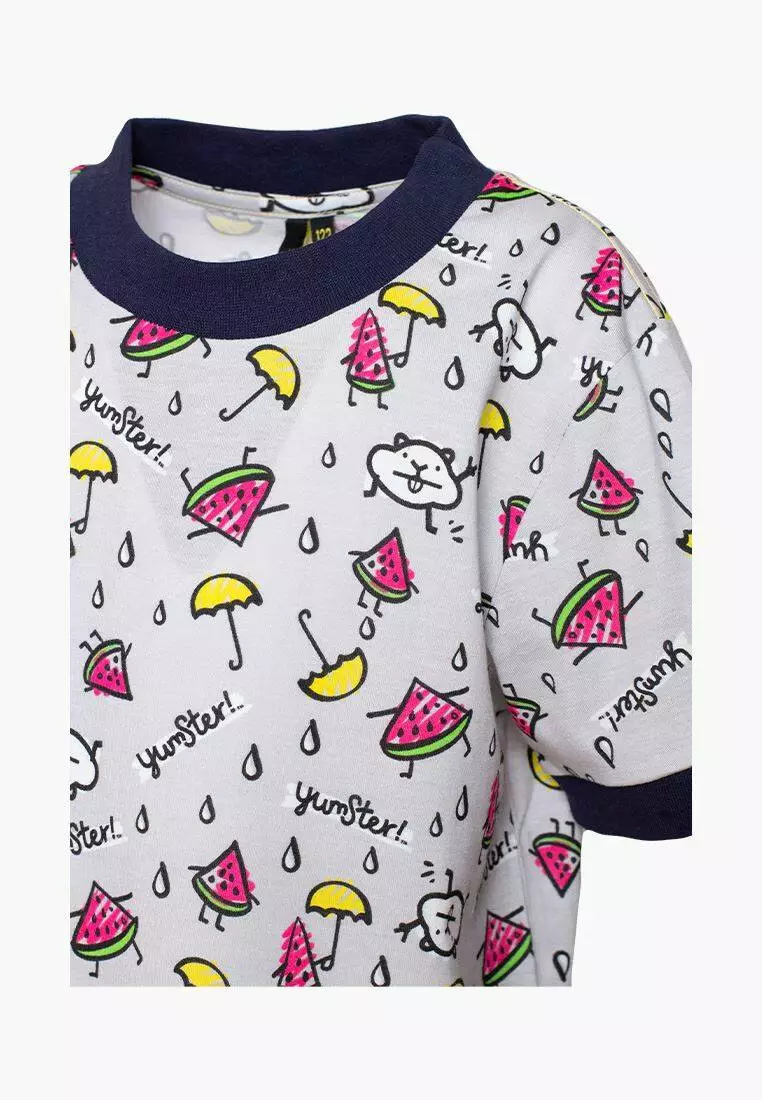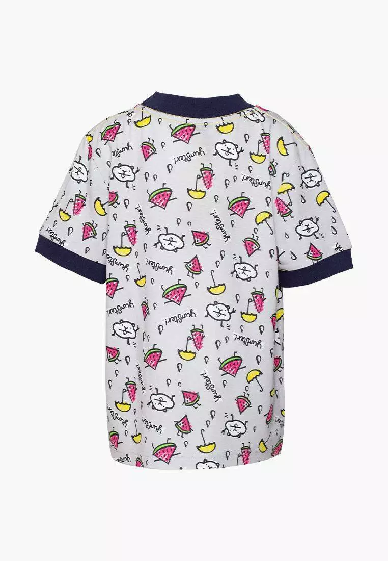 Деталі: Футболка світло-сірого кольору. Вільний прямий крій. Сині вставки на рукавах і горловині. Фірмовий принт.
