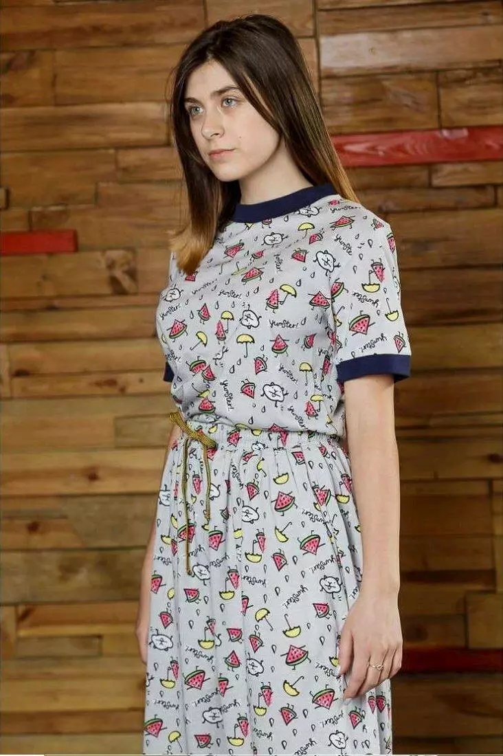 Трикотажна футболка сірого кольору з синіми вставками на рукавах і горловині. Для дівчат від 5 до 15 років.