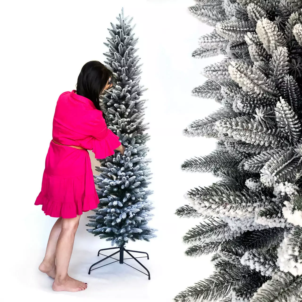 Всі голочки - литі, точна 3D імітація хвої живої ялинки. Об'ємне густе напилення на ялинці реалістично імітує сніг, який тільки що впав на гілки пухнастими пластівцями. Матеріалом розпилення є натуральна бавовна, вона екологічна і не має запаху, безпечна для дітей і дорослих.