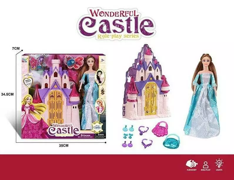 Home > Catalog > Toys > Accessories for dolls, dollhouses > Замок з лялькою KDL 57 (36/2) висота ляльки: 30 см, шарнірні з`єднання, знімна сукня, аксесуари, р. замка:20х32, звук, підсв.відч.,дверцята, в коробці wholesale