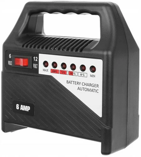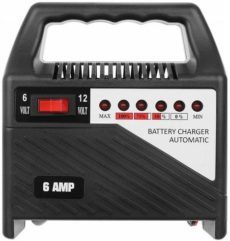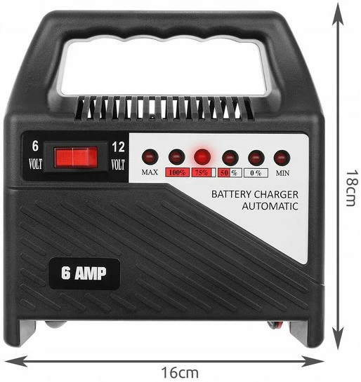 Зарядное устройство имеет переключатель, который позволяет выбрать мощность, необходимую для зарядки аккумулятора: 6 В или 12 В. Кроме того, на панели есть светодиоды, показывающие состояние заряда устройства в процентах. Он чрезвычайно легкий и маленький, поэтому его можно легко перемещать и хранить в машине или дома.