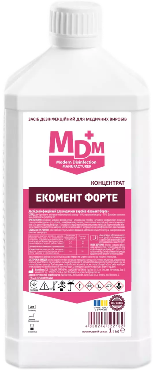 Засіб дезінфекційний для медичних виробів Екомент Форте - концентрований багатофункціональний дезінфекційний засіб із широким спектром антимікробної дії. Має виражені бактерицидні, віруліцидні, фунгіцидні та спороцидні властивості. Ефективний проти збудників туберкульозу, гепатитів, ВІЛ та внутрішньолікарняних інфекцій.Завдяки комбінації глутарового альдегіду та четвертинних амонієвих сполук забезпечує високу ефективність знезараження. Не фіксує білкові забруднення, добре змивається, не викликає корозії та не залишає нальоту.