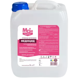 Засіб дезінфекційний для медичних виробів Медіоцид - готовий до використання дезінфекційний засіб швидкої дії у вигляді безбарвної прозорої рідини. Має виражену бактерицидну, віруліцидну, фунгіцидну та туберкулоцидну активність. Не фіксує білкові забруднення, не залишає нальоту, швидко висихає. Сумісний із більшістю матеріалів (метал, скло, гума, полімери), за винятком поверхонь, чутливих до спиртів (низькосортні фарби, лак, акрилове скло).