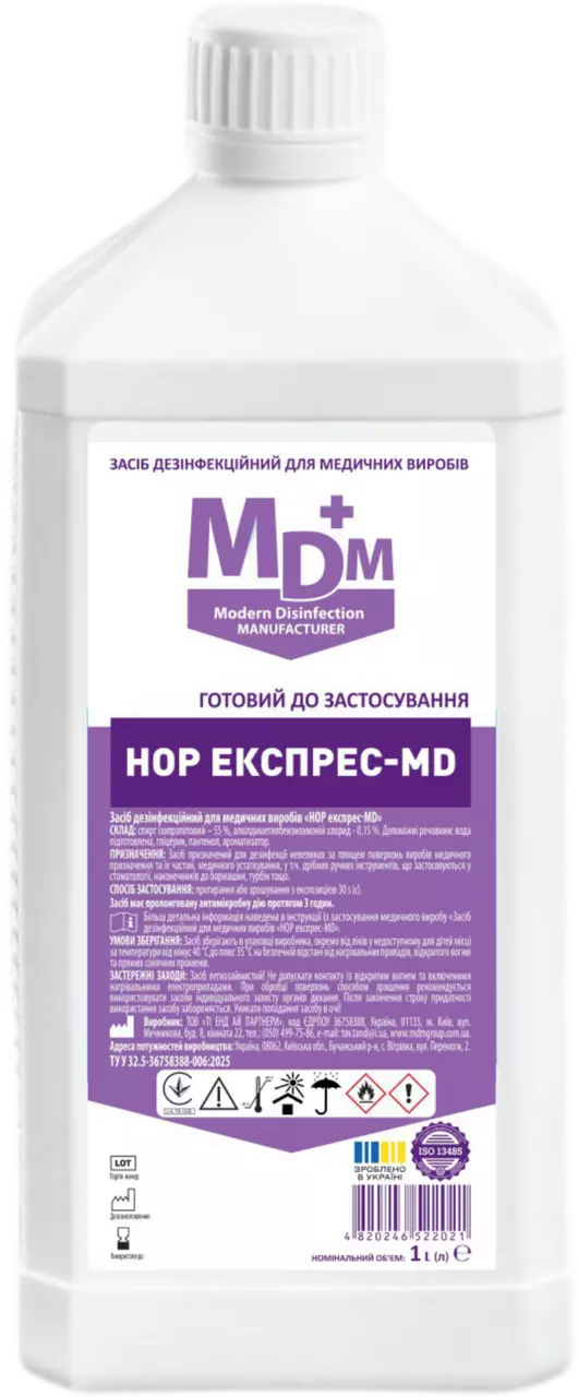 Засіб дезінфекційний для медичних виробів НОР експрес-MD - готовий до застосування дезінфекційний засіб у вигляді прозорої безбарвної або забарвленої рідини із характерним запахом спирту. Має виражену бактерицидну, віруліцидну, фунгіцидну та туберкулоцидну дію. Підходить для швидкої дезінфекції медичних виробів, у тому числі дрібних інструментів, стоматологічних наконечників, бормашин, турбін та поверхонь медичного обладнання. Не пошкоджує більшість матеріалів, не фіксує білкові забруднення, швидко висихає та не потребує змивання (окрім випадків контакту зі слизовими оболонками). Має пролонговану антимікробну дію до 3 годин.