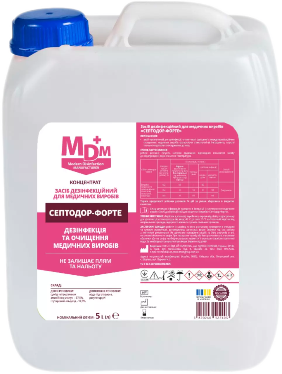 Засіб дезінфекційний для медичних виробів Септодор-Форте — багатофункціональний концентрований дезінфекційний засіб широкого спектра дії. Має виражені бактерицидні, віруліцидні (включаючи віруси гепатитів, ВІЛ, поліовірус), фунгіцидні та туберкулоцидні властивості, активний проти збудників особливо небезпечних інфекцій. Призначений для дезінфекції, у тому числі суміщеної з передстерилізаційним очищенням, виробів медичного призначення, у тому числі стоматологічних інструментів, жорстких і гнучких ендоскопів та інструментів до них. Засіб не фіксує білкові забруднення, не пошкоджує оброблювані матеріали, не викликає корозії та легко змивається, не залишаючи слідів.
