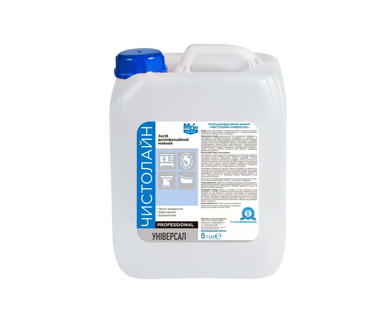 Засіб дезінфекційний мийний «Чистолайн-Універсал» — це багатофункціональний препарат, призначений для одночасного миття та дезінфекції широкого спектра поверхонь. Завдяки наявності 2-феноксіетанолу (1%) і комплексу аніонних, неіоногенних та амфотерних ПАР, засіб забезпечує виражену бактерицидну, віруліцидну та фунгіцидну дію, не фіксує забруднення, легко змивається та не пошкоджує оброблювані матеріали. Підходить для щоденного гігієнічного прибирання і знезараження навіть на об’єктах з підвищеними санітарними вимогами.