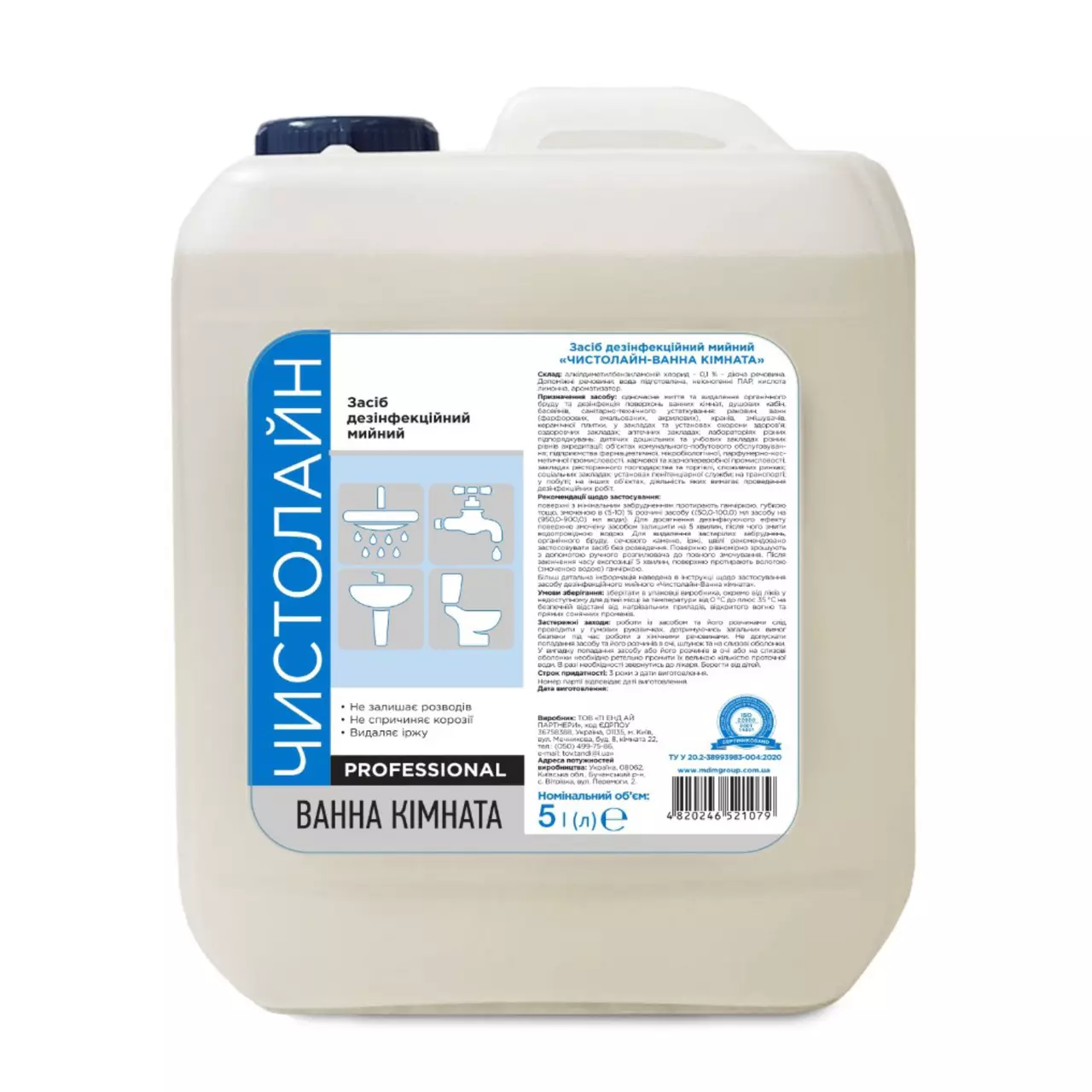 Засіб дезінфекційний мийний «Чистолайн Ванна кімната» — це високоефективний багатофункціональний засіб, призначений не лише для глибокого очищення, а й для одночасної дезінфекції сантехнічних поверхонь. Завдяки поєднанню активних компонентів засіб забезпечує антибактеріальну, фунгіцидну та віруліцидну дію, видаляє органічні забруднення, сечовий камінь, вапняний наліт, залишки мила, цвіль, іржу та неприємні запахи. Не фіксує бруд, легко змивається, не ушкоджує керамічні, порцелянові, полімерні, хромовані, скляні та інші стійкі до кислот матеріали.