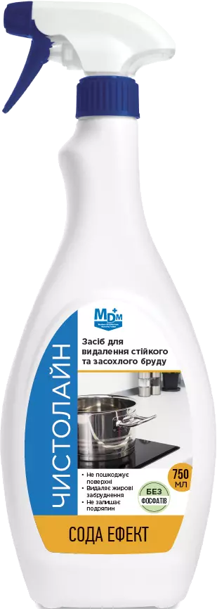 Миючий засіб «Чистолайн Сода Ефект» — це готовий до використання багатофункціональний засіб у вигляді прозорої рідини з приємним ароматом, до складу якого входять карбонат натрію, аніонні та неіоногенні ПАР, ароматизатор і консервант. Призначений для ефективного видалення стійких жирових, білкових, ґрунтових забруднень, сажі й кіптяви з широкого спектра поверхонь: алюмінієвих, склокерамічних, хромованих, керамічних, порцелянових, скляних, нержавіючої сталі та полімерів. Не залишає слідів, легко змивається і не пошкоджує делікатні матеріали.