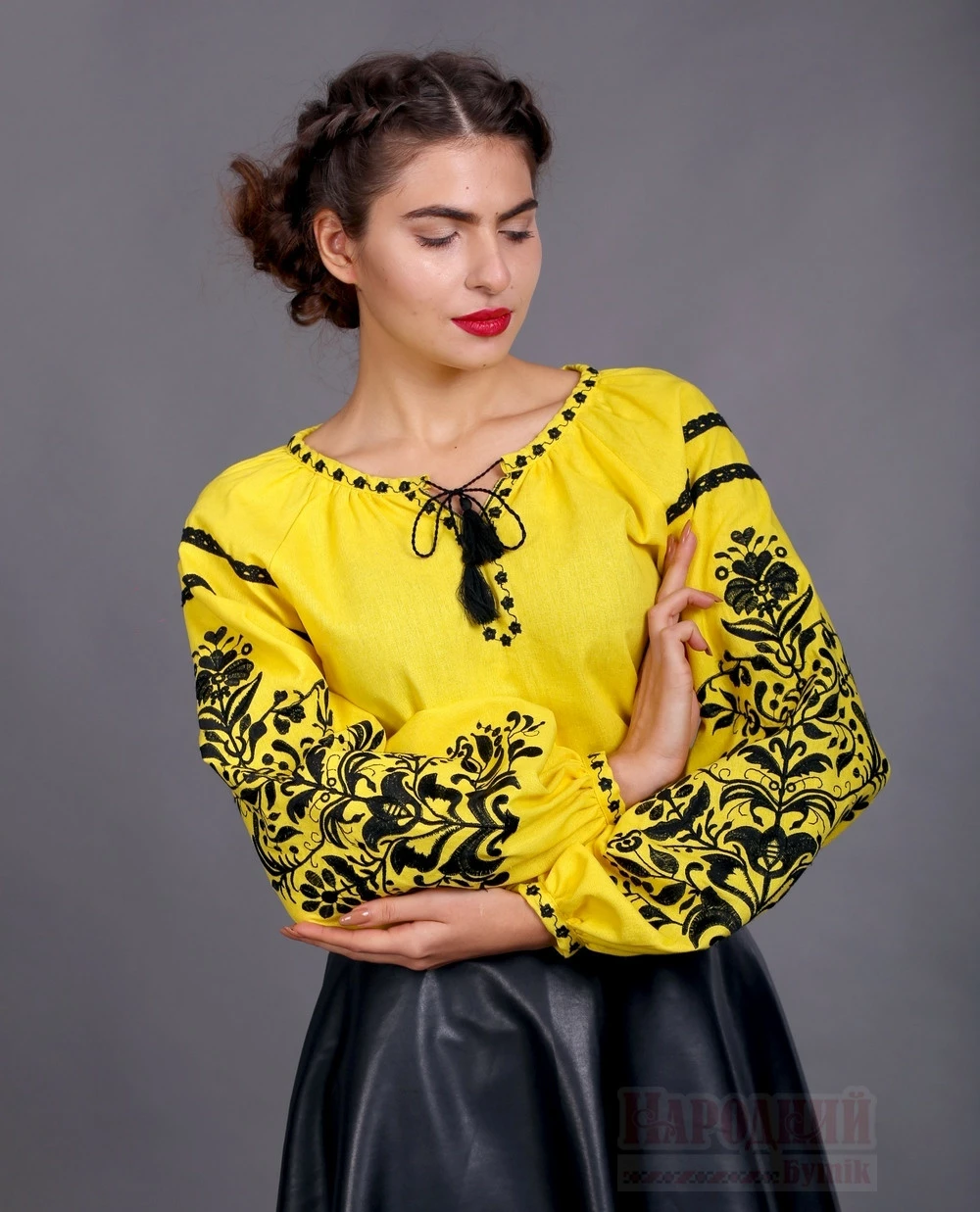 Красивая женская вышиванка из желтого льна с узором "дерево жизни" - украсит ваш гардероб. Яркая желтая ткань вышита шелковистыми черными нитками. Узор гладью украшает пышные рукава изделия и смотрится объемно и богато. Вышивку на рукавах дополняет ажурное черное кружево. Орнамент "Дерево жизни" символизирует мировую взаимосвязь и долгую жизнь. Желтую вышиванку Дерево жизни можно отлично сочетать с современными вещами.
