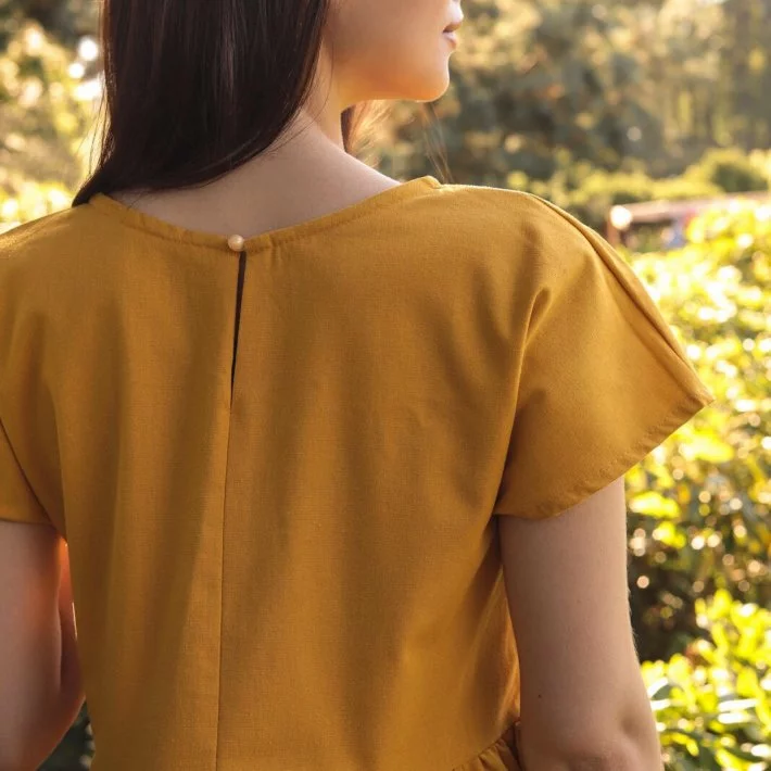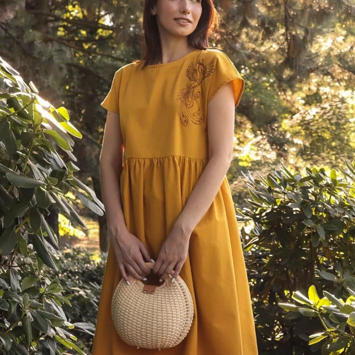 Сукня з натурального льону вільного крою із збіркою по талії. На
