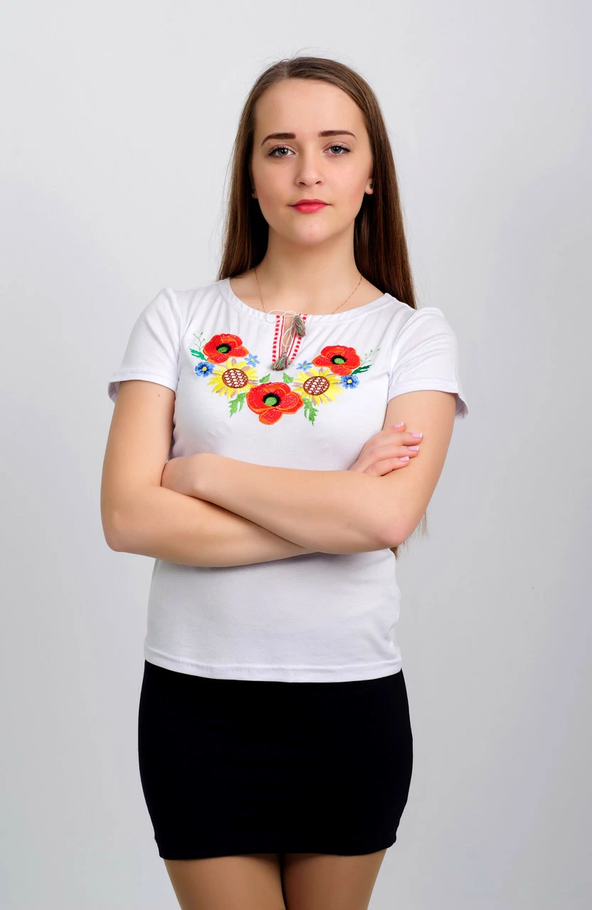 Белая вышитая футболка с цветочным орнаментом из маков и