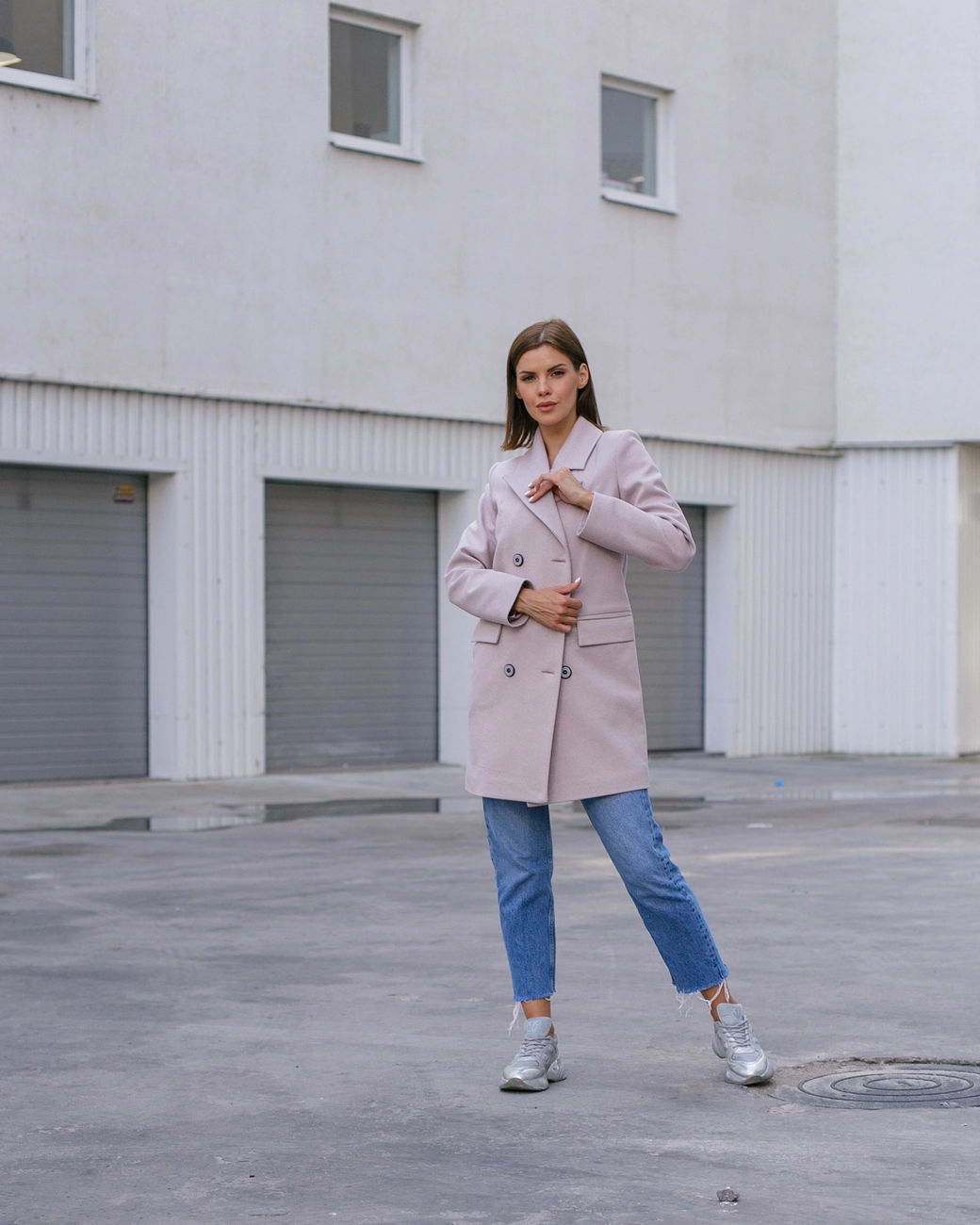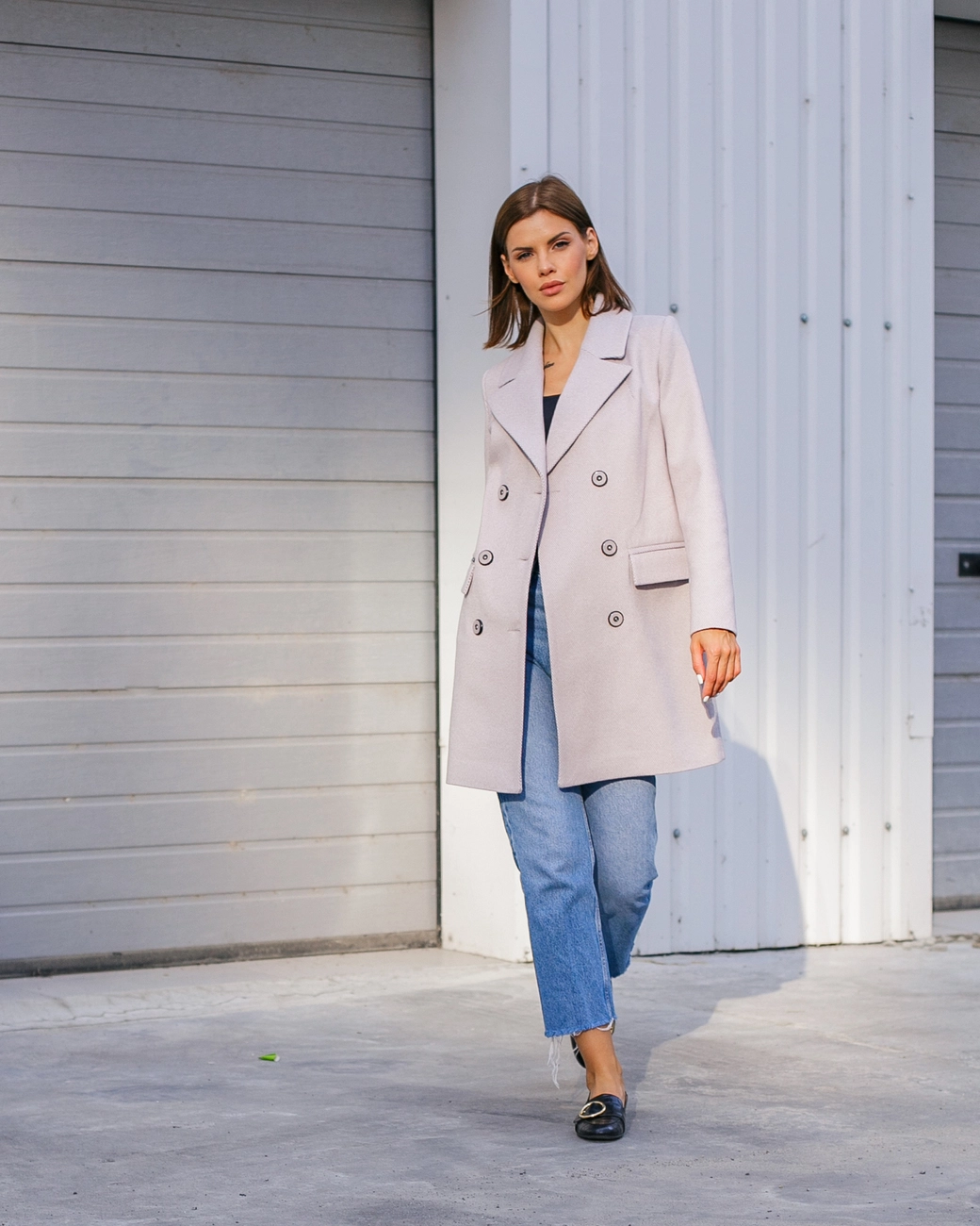 Двубортный полуприталенный жакет-пальто с поясом. Размерный ряд с 40 по 50