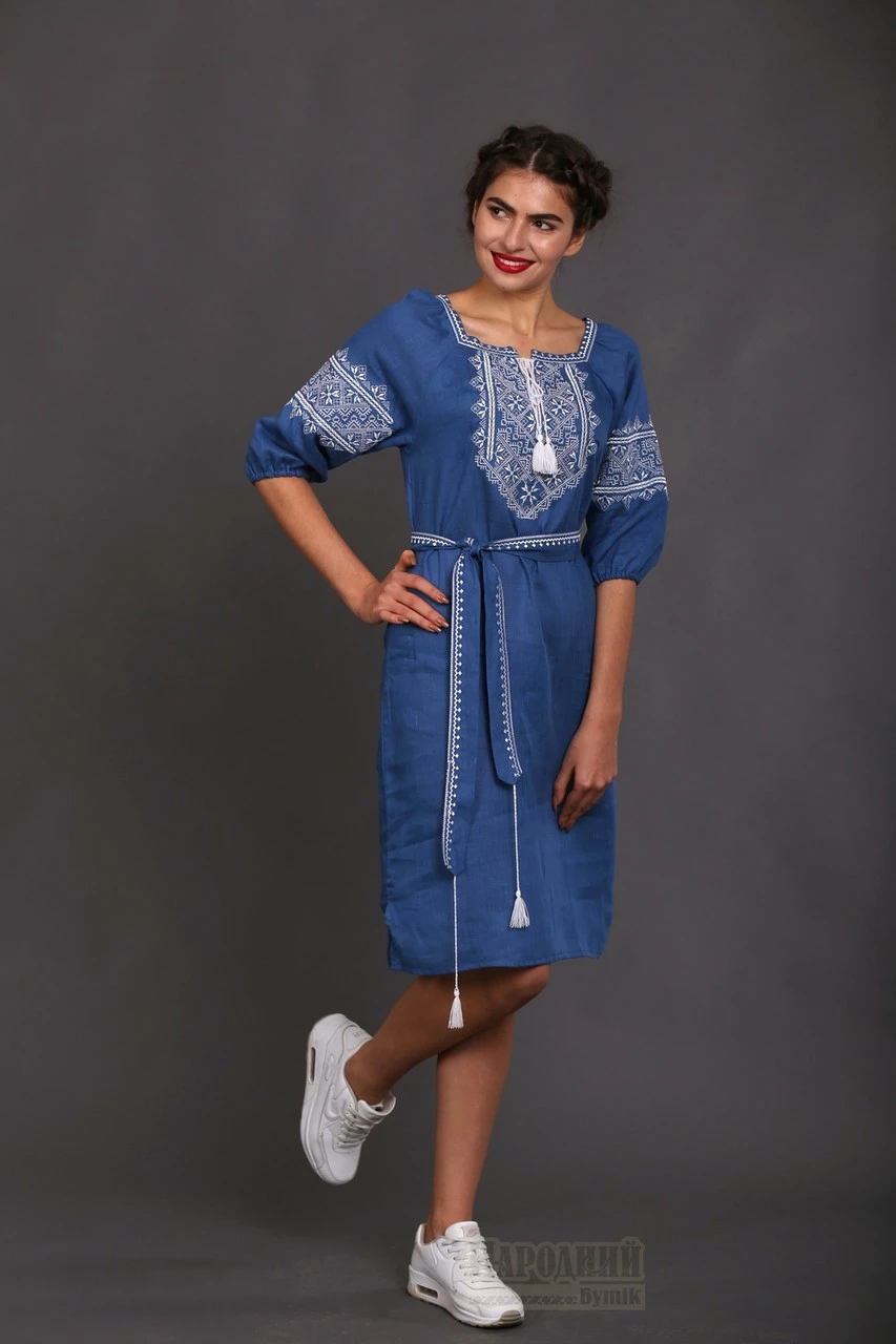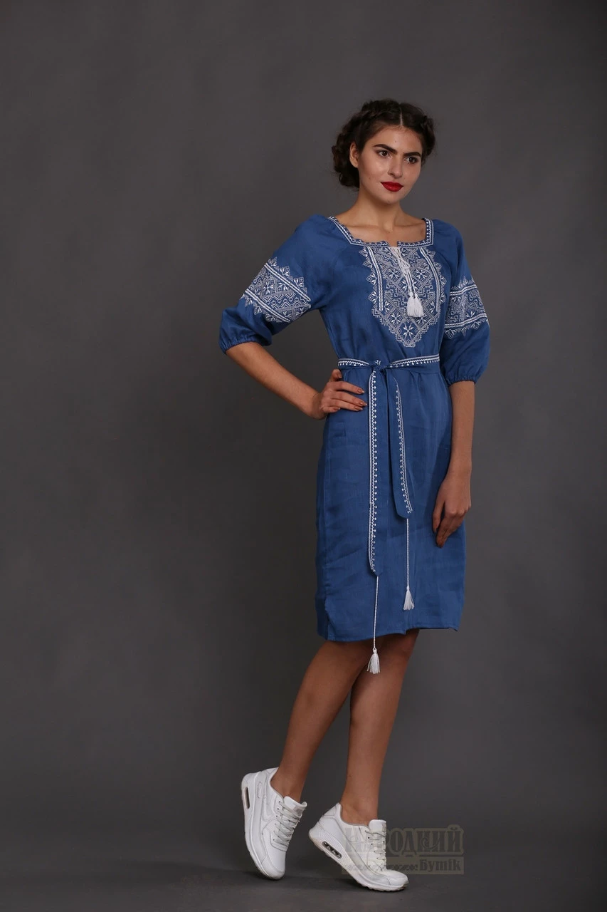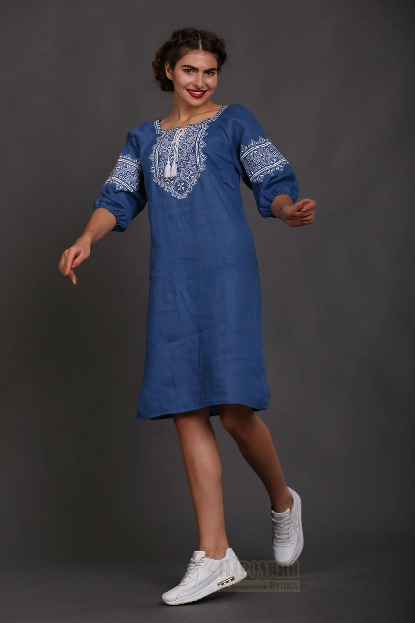 платья. Белая вышивка гармонично смотрится на льне цвета индиго.