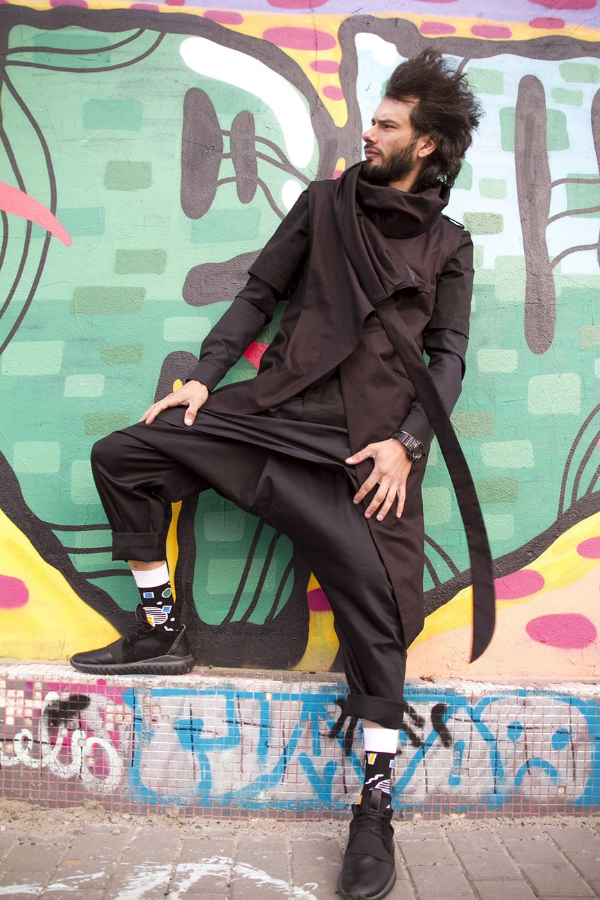 Удлиненная асимметричная модель без застежки, карманы в боковых швах, объемный воротник-капюшон фиксируется лентой.