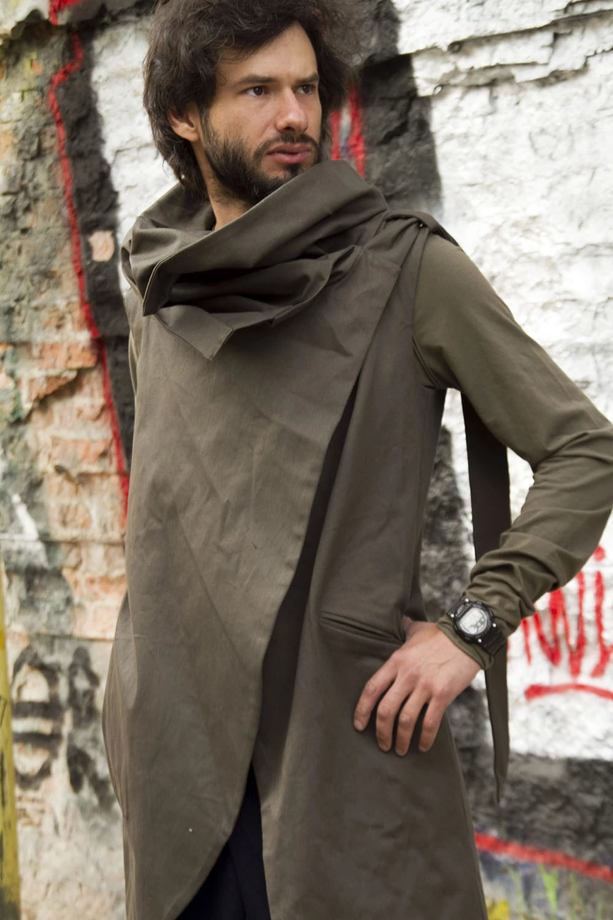 Удлиненная асимметричная модель без застежки, карманы в боковых швах, объемный воротник-капюшон фиксируется лентой.