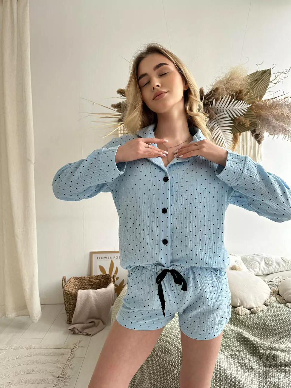 Комплект складається: сорочка +шорти. Шорти з кишенями, пояс з куліскою.