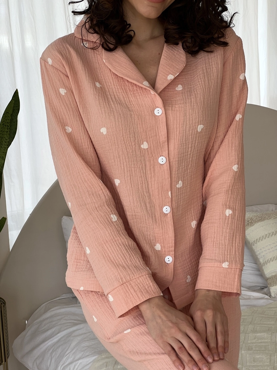 Жіноча Муслінова піжама Серця COSY штани+сорочка рожева пудра M100P