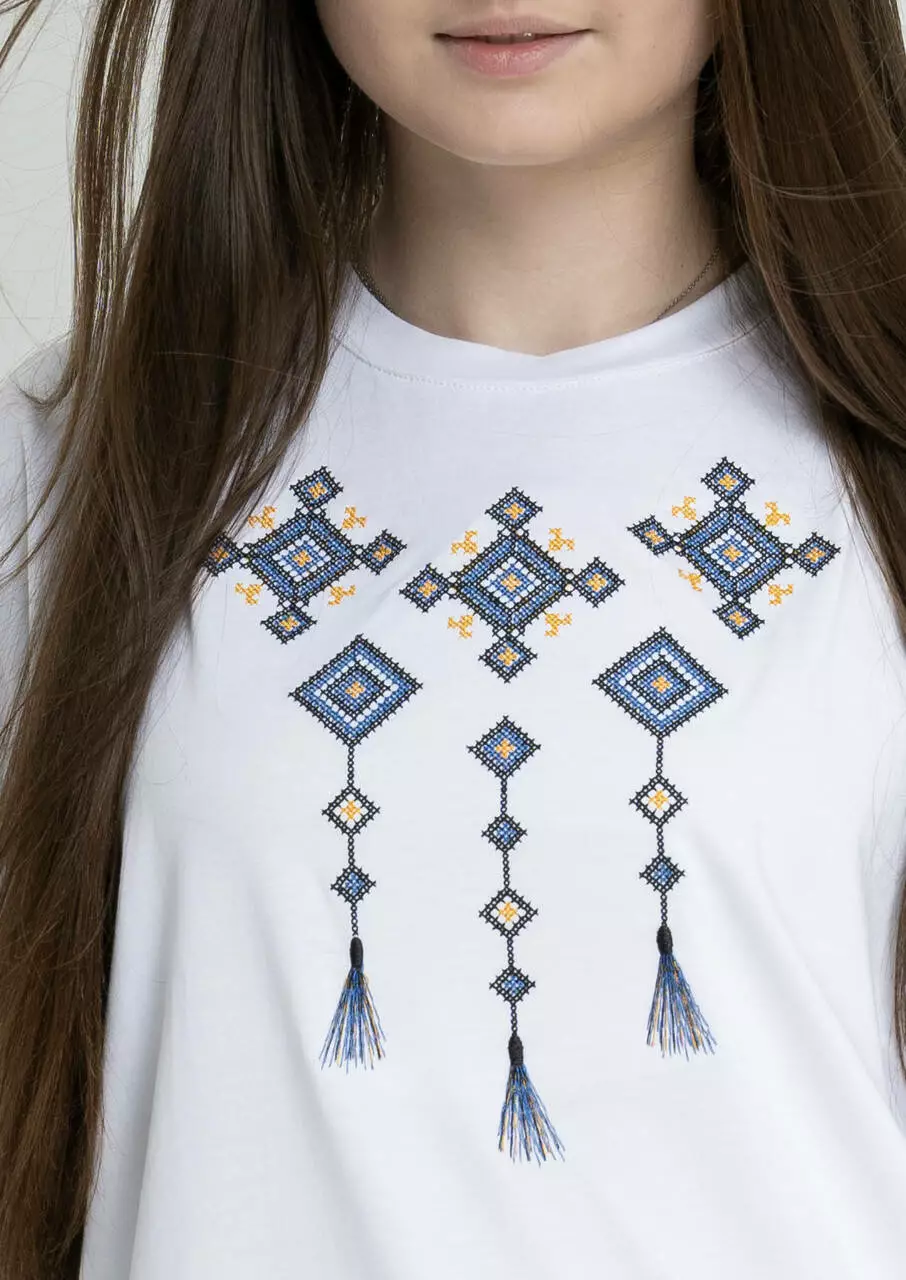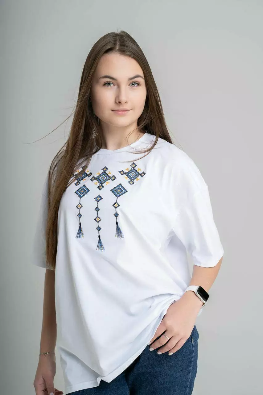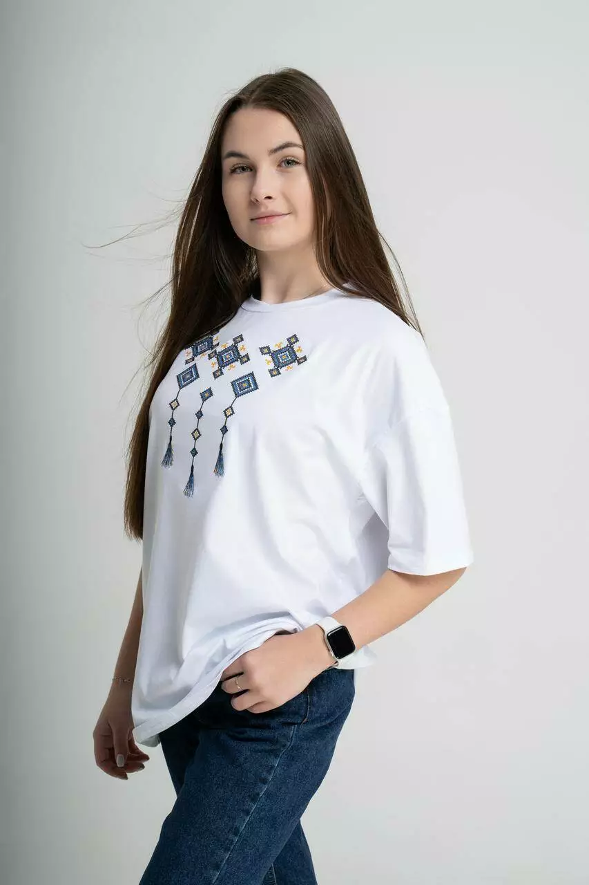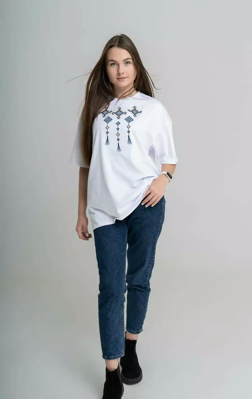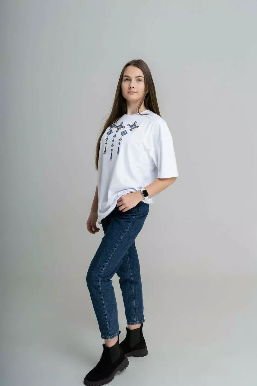 У цій моделі лінія плеча подовжена, краї низу прямі, а короткі широкі рукави створюють ефект тієї самої трендової футболки ніби з чоловічого плеча. З такою річчю ти зможеш поєднувати стильні штани, шорти та джинси різних фасонів. Але головною особливістю цієї футболки є геометричний вишитий орнамент на грудях. Так сказати це вишита футболка із сучасним акцентом.