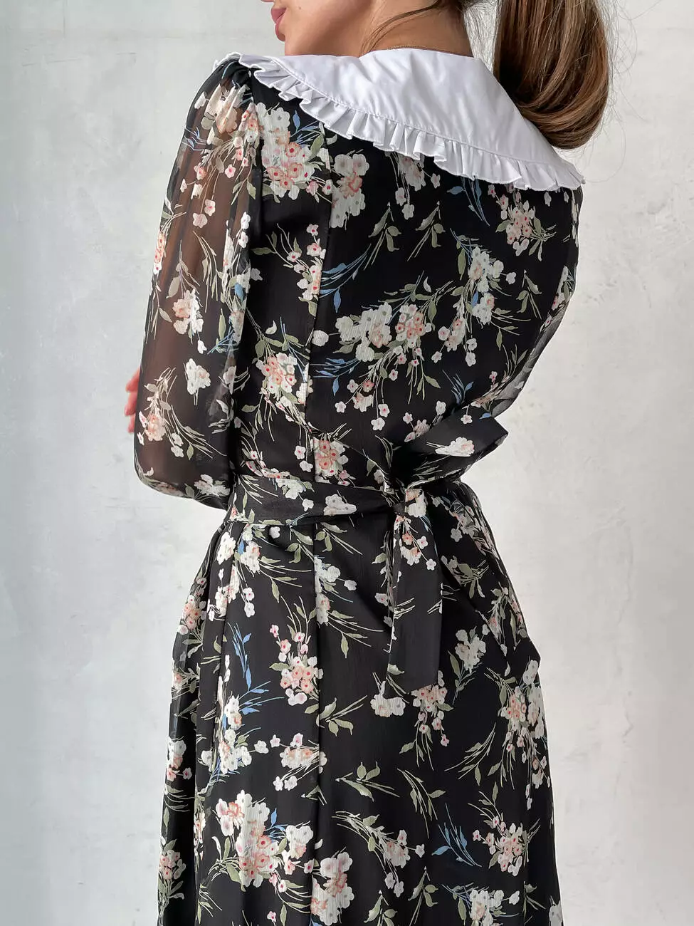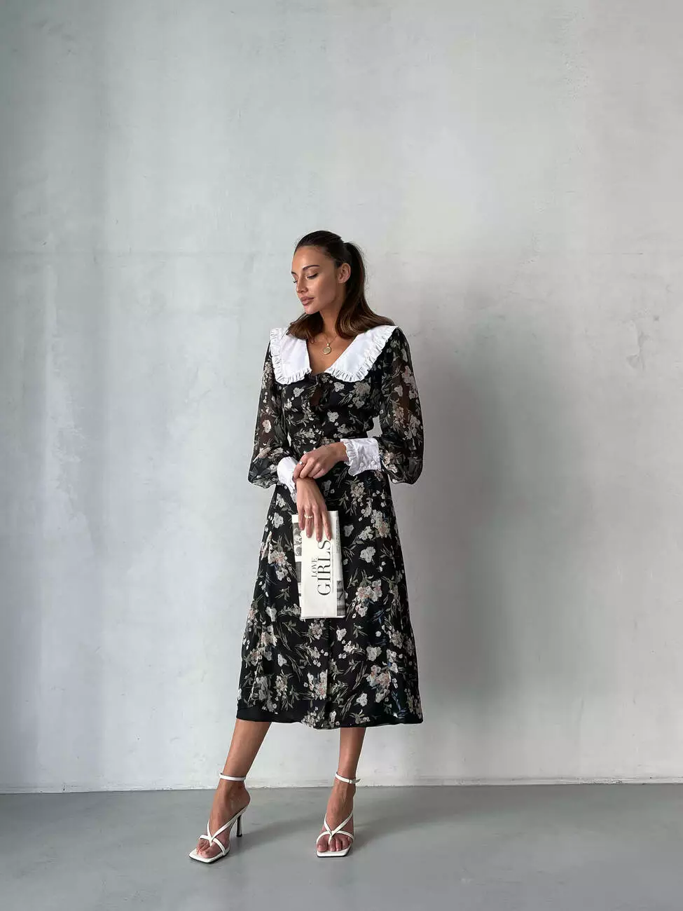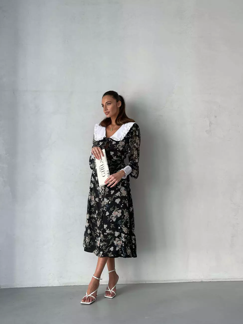 Жіноча шифонова сукня VENETTA з білим комірцем довжини міді з квітковим принтом чорного кольору