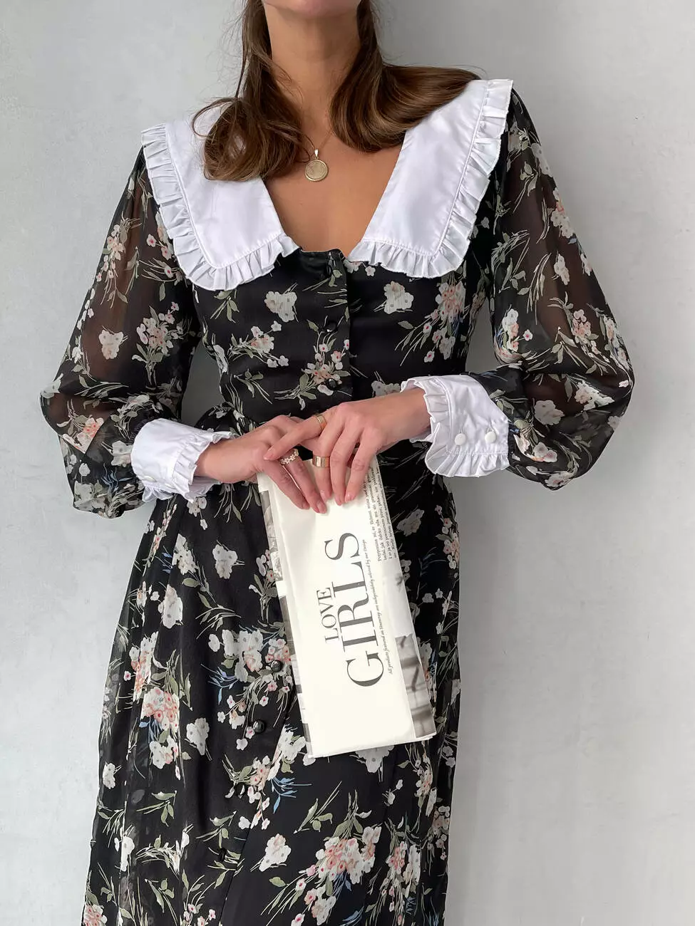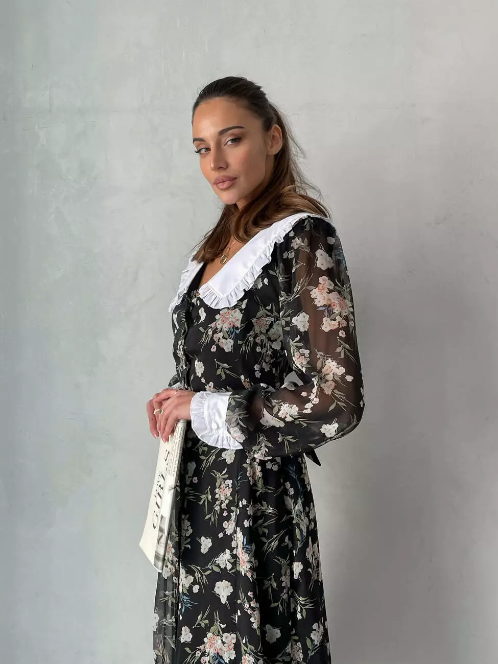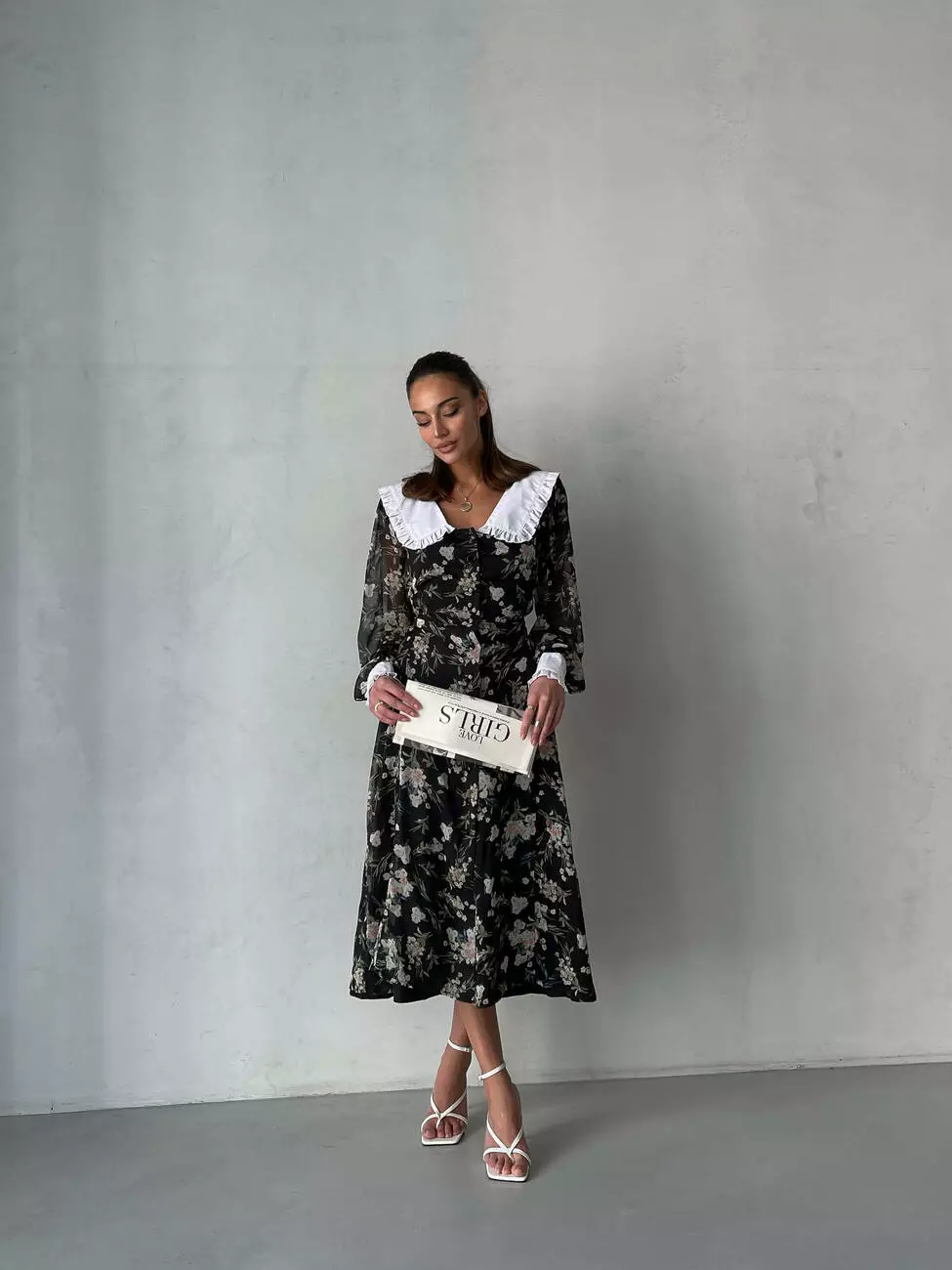 Жіноча шифонова сукня VENETTA з білим комірцем довжини міді з квітковим принтом чорного кольору