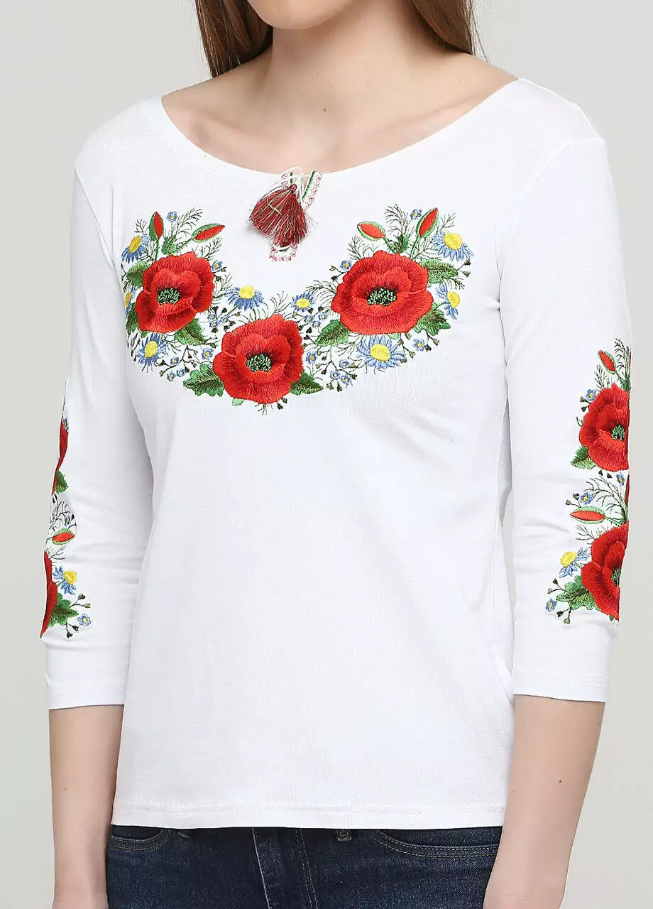 Жіноча вишиванка із рукавом три четвертри "Маків цвіт" - це саме те, що необхідно вашому етно-стилю. Модель виконана у білосніжному білому кольорі за рахунок якого вишивака виглялає більш насиченіше та яскравіше. Вишита футболка прикрашена на грудях трьома великими маками і зеленю. Окрім цього збоку на рукавах розміщена аналогічна вишивка, що і на грудях, але в меншому розмірі.