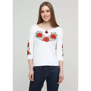 Жіноча вишиванка із рукавом три четвертри "Маків цвіт" - це саме те, що необхідно вашому етно-стилю. Модель виконана у білосніжному білому кольорі за рахунок якого вишивака виглялає більш насиченіше та яскравіше. Вишита футболка прикрашена на грудях трьома великими маками і зеленю. Окрім цього збоку на рукавах розміщена аналогічна вишивка, що і на грудях, але в меншому розмірі.