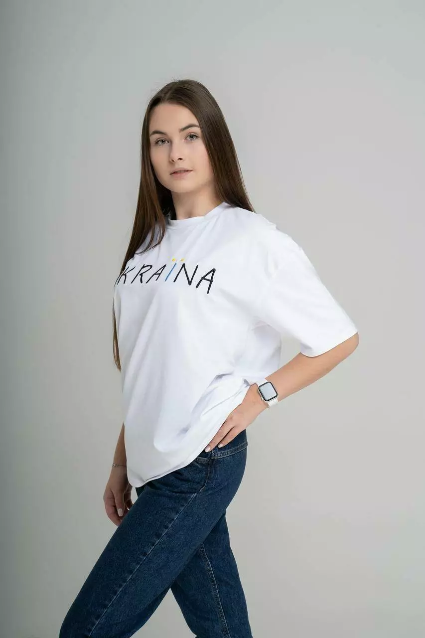 Жіноча вишита oversize футболка білого кольору в сучасному стилі "Україна"