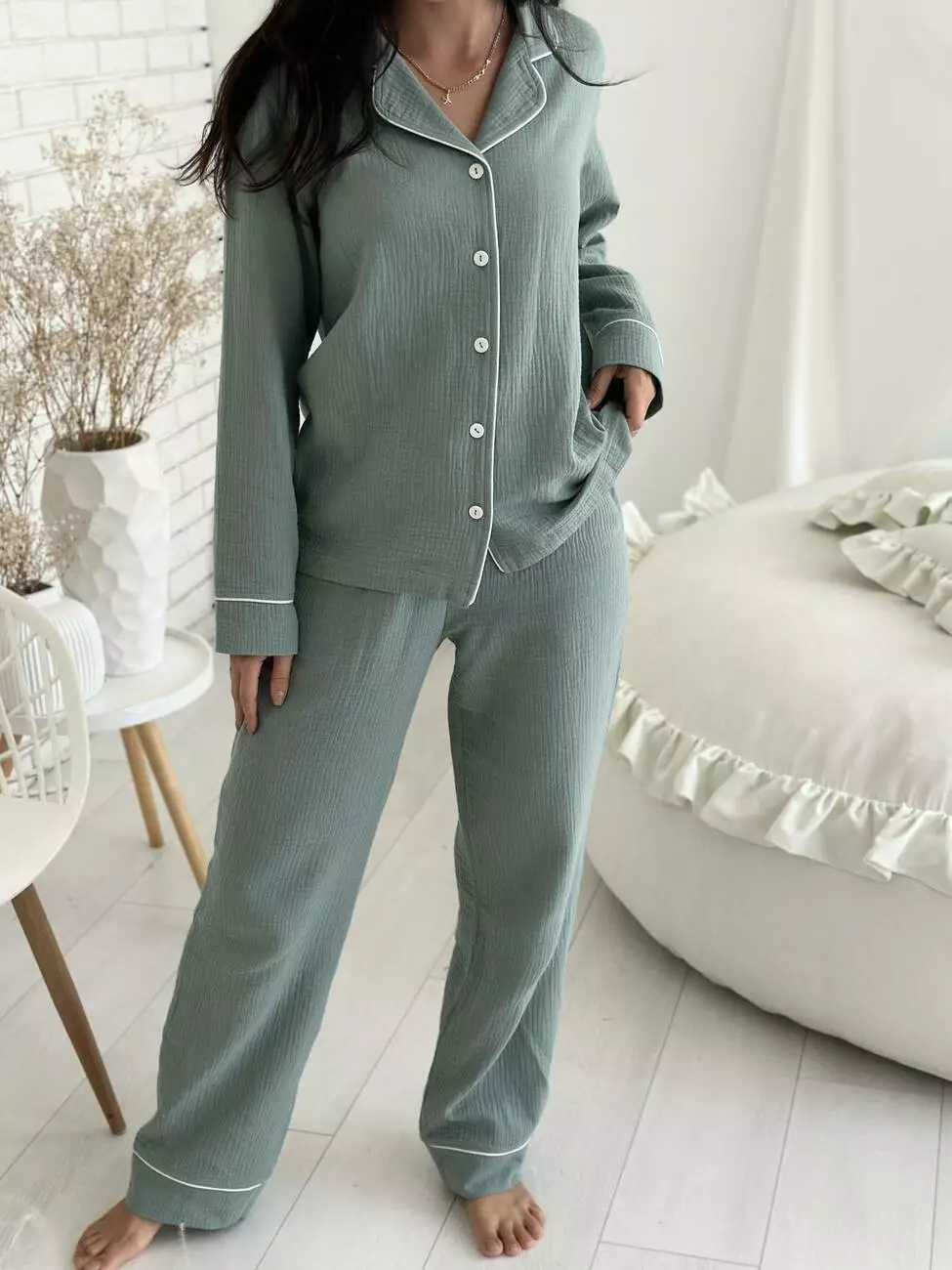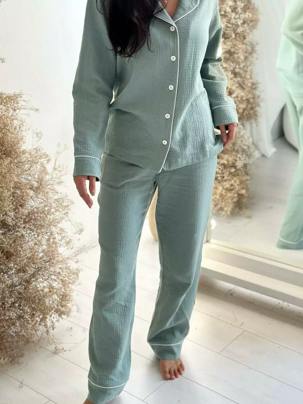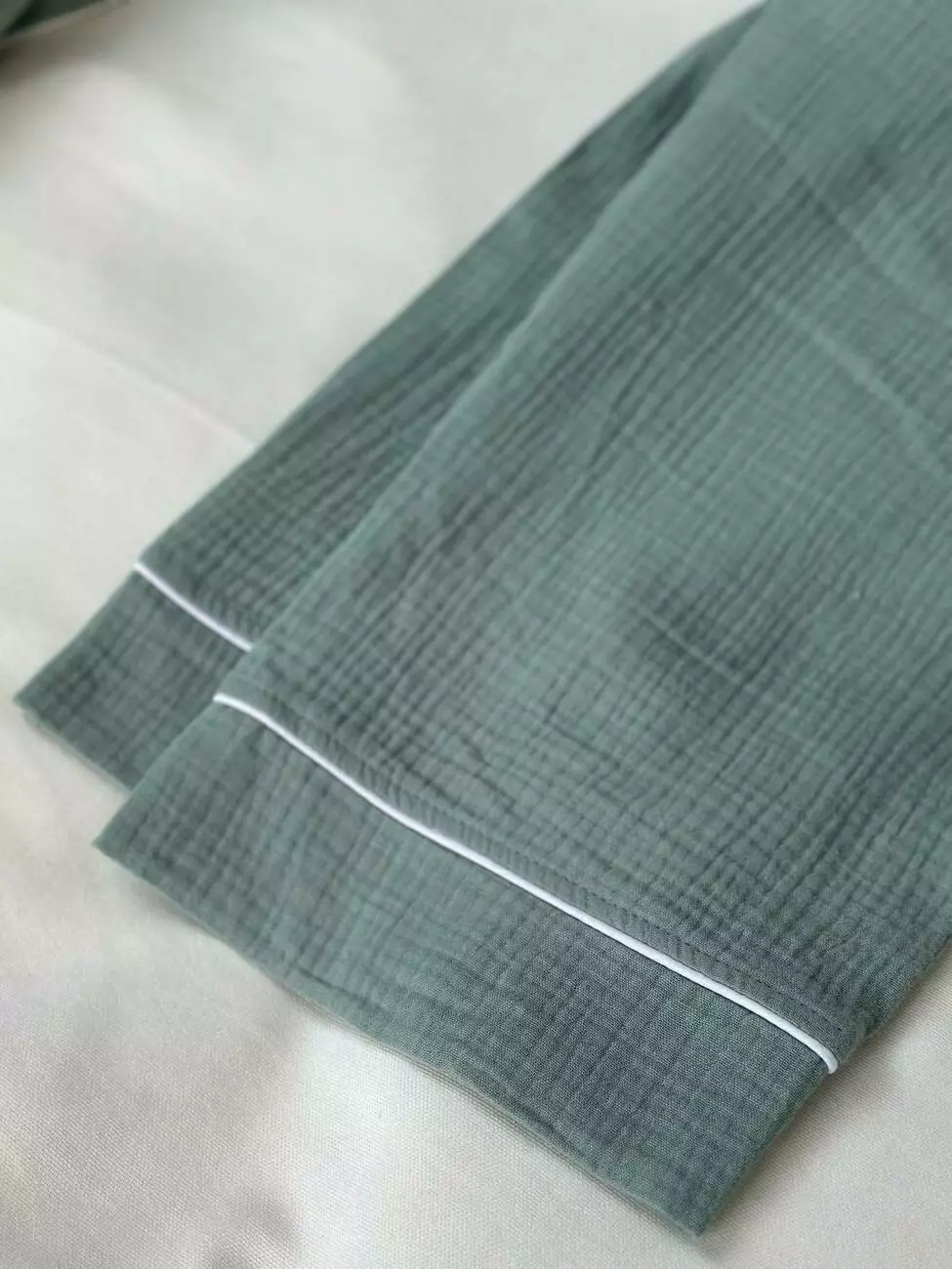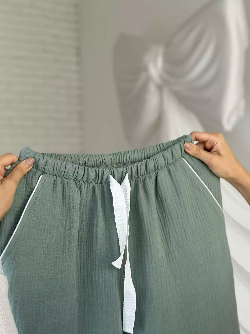 Жіночі муслінові штани VIVA М’які, натуральні та зручні — ці штани з колекції VIVA стануть улюбленою частиною вашого домашнього гардероба. Вони однаково добре підходять як для сну, так і для відпочинку вдома, коли температура комфортна у будь-яку пору року. Особливості моделі: - М’яка еластична резинка в поясі + кулиска для регулювання об’єму талії - Зручні кишені для додаткового комфорту - Оздоблення елегантним білим кантом по краях Колір: натуральний евкаліпт — спокійний, універсальний, пасує будь-кому Тканина: 100% бавовна, двошаровий муслін — дихає, приємний до шкіри, гіпоалергенний Штани можна поєднувати з сорочкою на ґудзиках або футболкою з колекції VIVA, створюючи як класичний піжамний комплект, так і легкий домашній образ. VIVA — для тих, хто цінує свободу рухів, натуральність і затишок у кожному дотику.