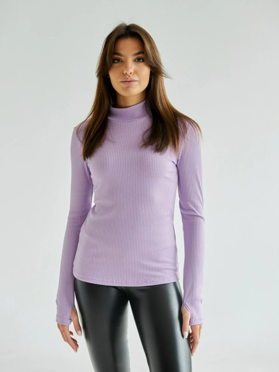 Жіночий гольф з високим горлом із фактурного матеріалу. Незамінна частина гардеробу в осінньо-весняний та зимовий сезон. Модель з довгим рукавом та вирізом для пальця.