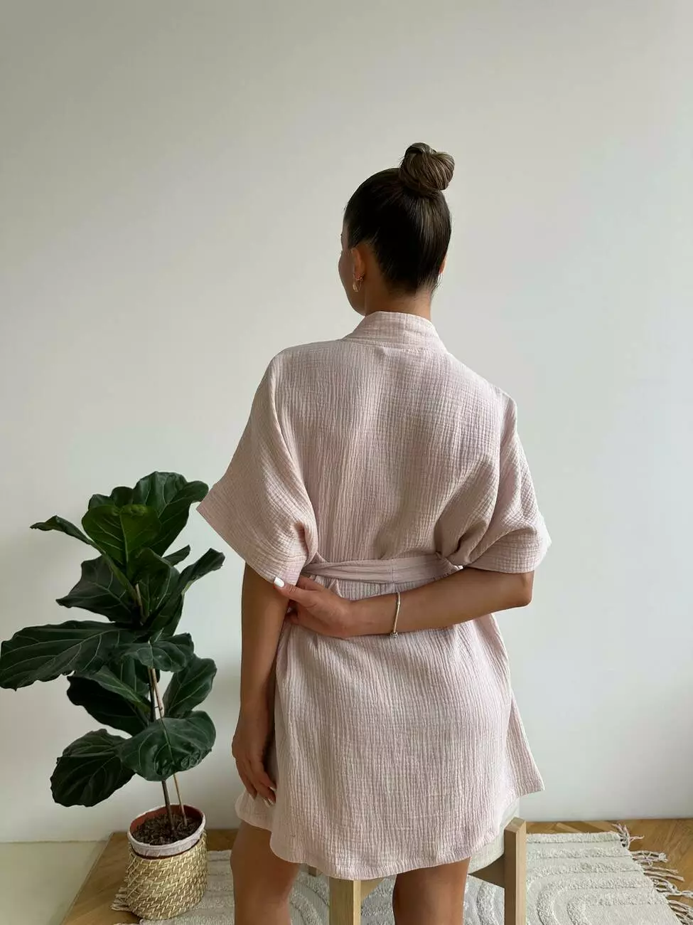Жіночий мусліновий короткий халат у ніжному пудровому кольорі – ідеальний супутник для літньої відпустки.