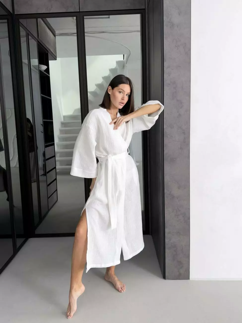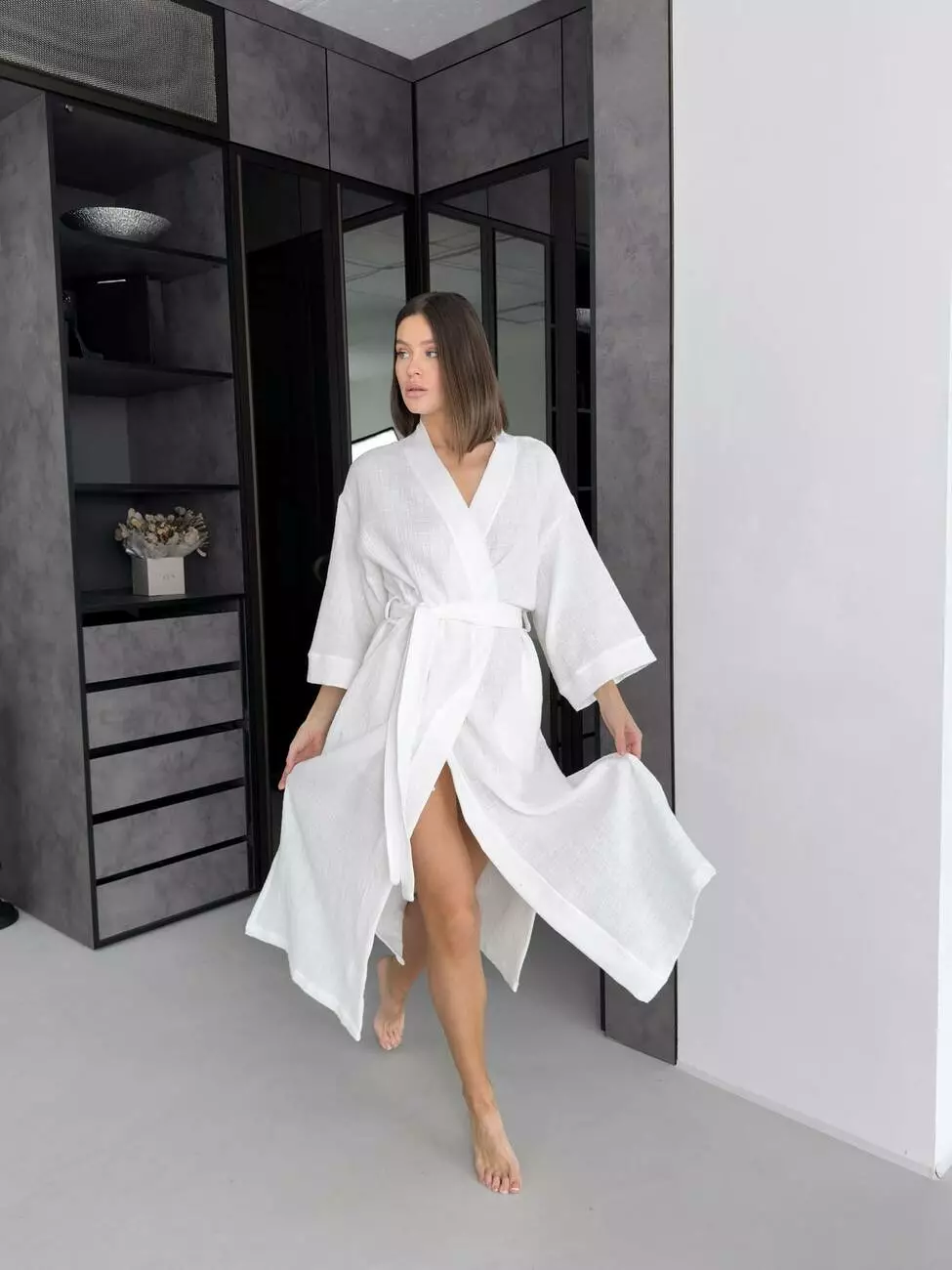 Білий халат-кімоно з фактурного мусліну – чистота стилю та витонченості