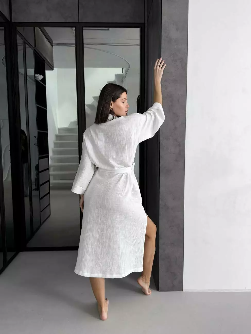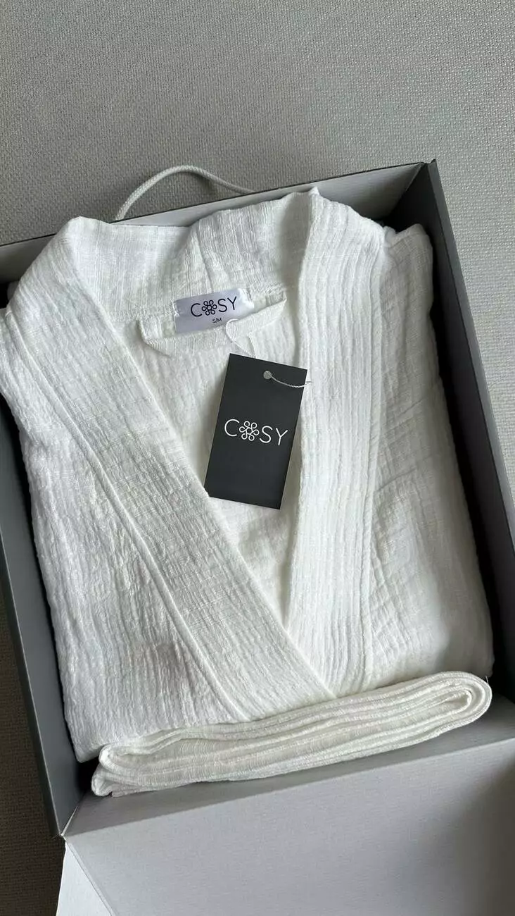 Цей халат – втілення естетики стриманої розкоші. Його білий колір символізує чистоту та легкість, а фактурний муслін із ніжною лляною ноткою додає виробу шляхетного вигляду.