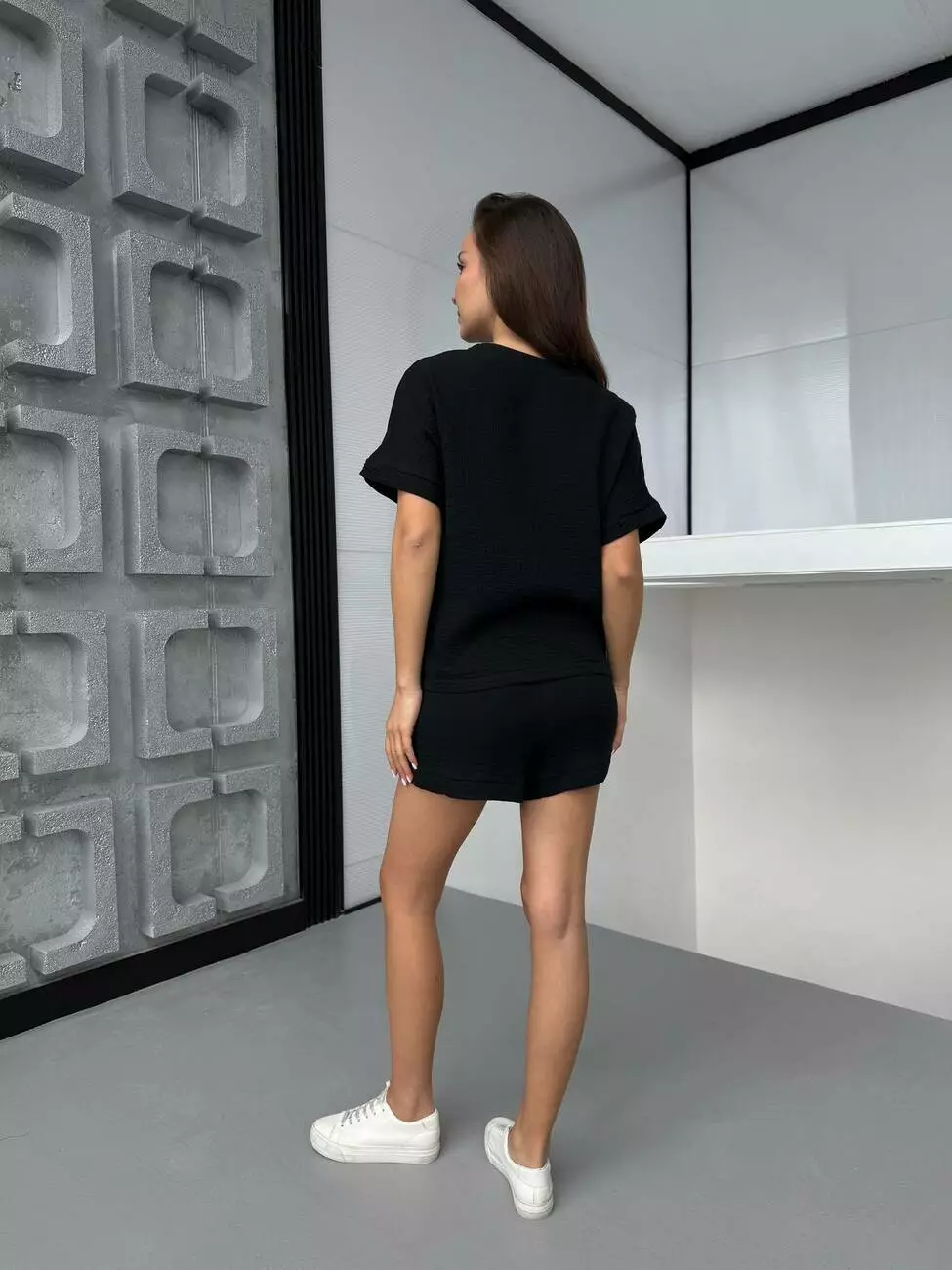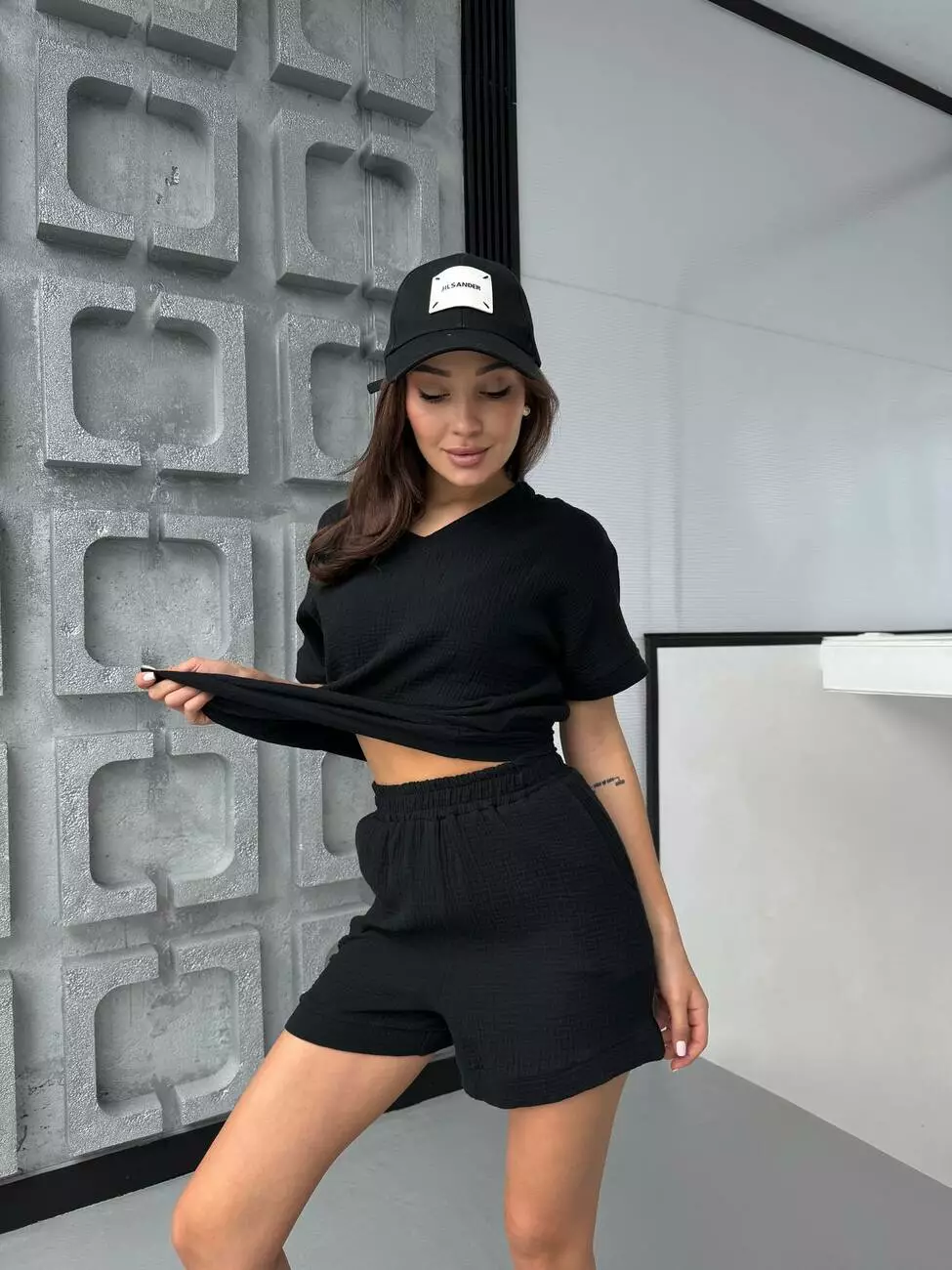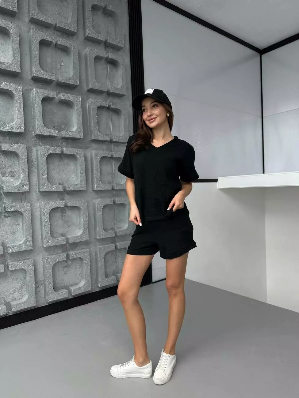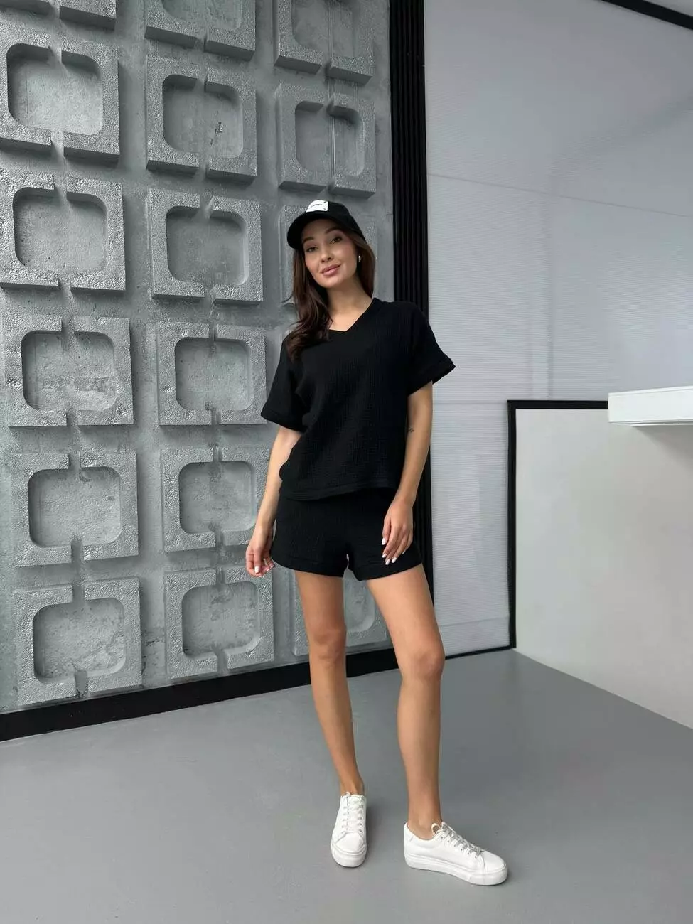 Комплект складається з вільної футболки з V-подібним вирізом і шортів з кишенями.