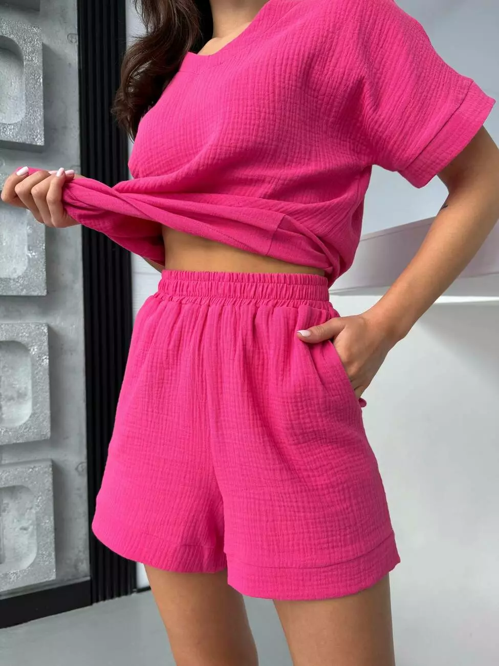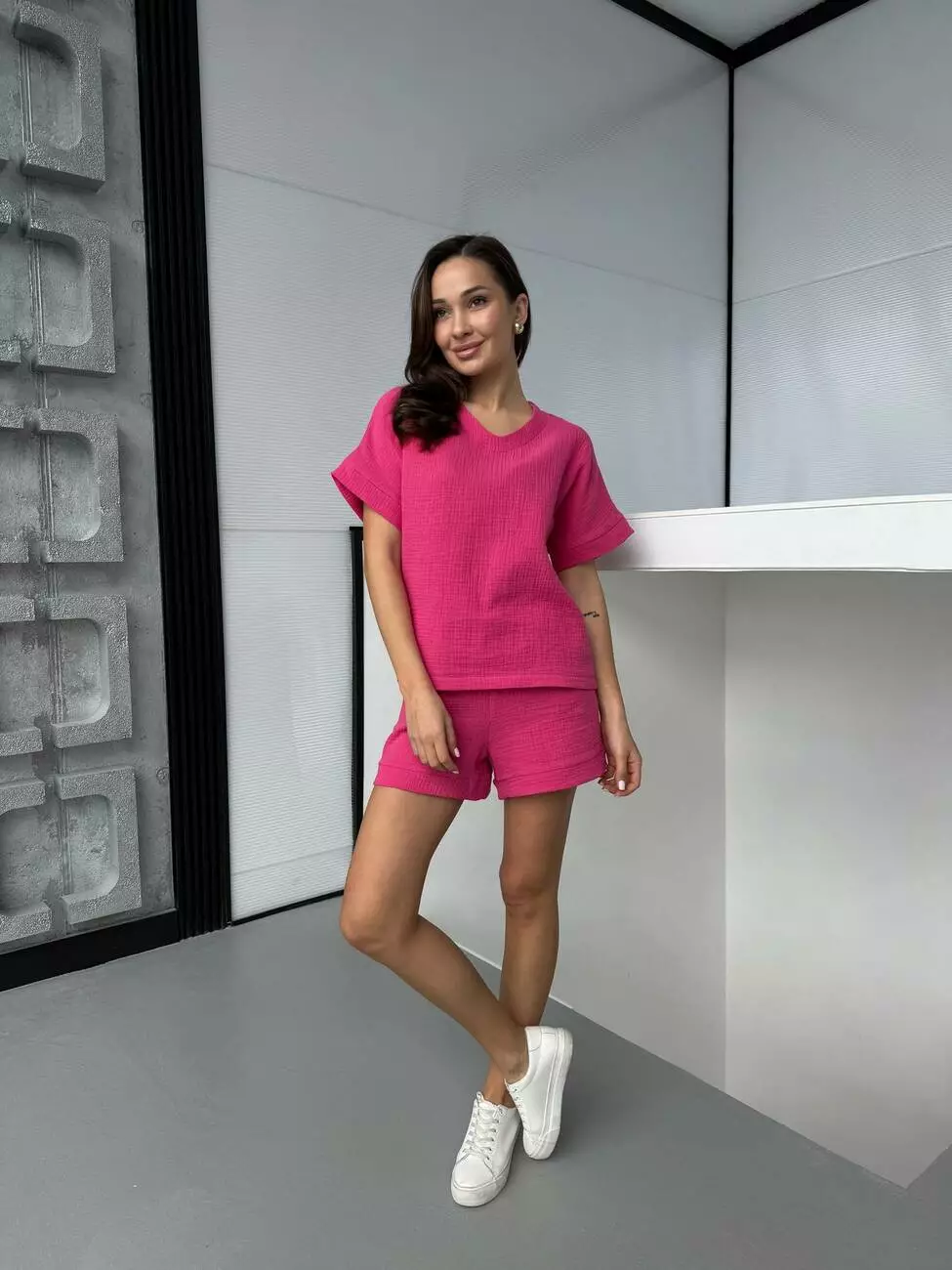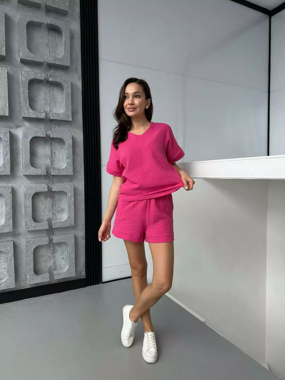 Комплект складається з футболки з елегантним V-подібним вирізом і зручних шортів із кишенями.