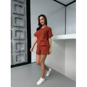 Комплект складається з футболки з елегантним V-подібним вирізом і зручних шортів із кишенями.