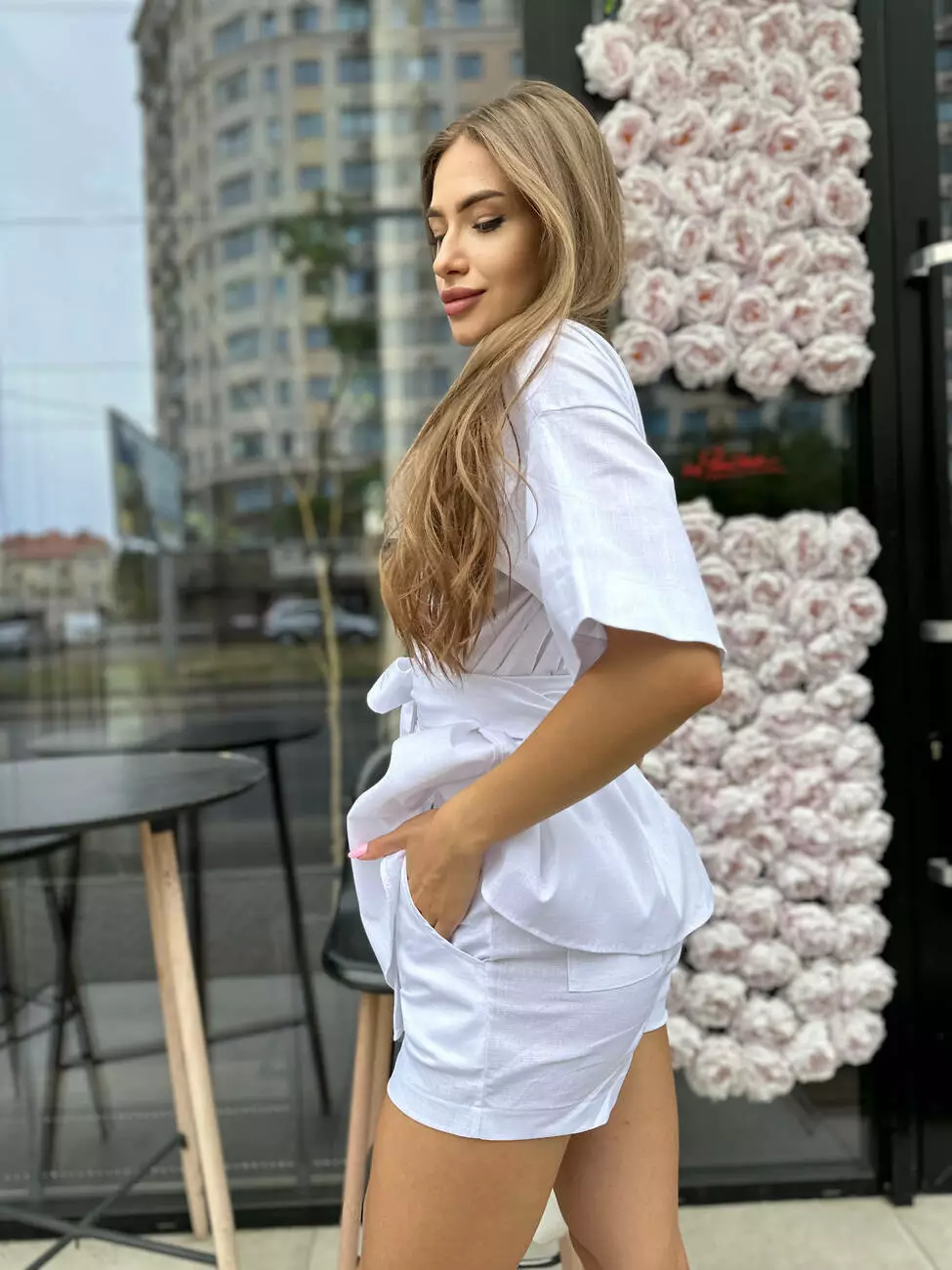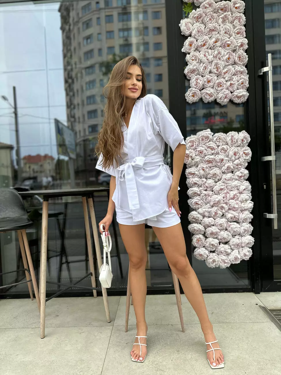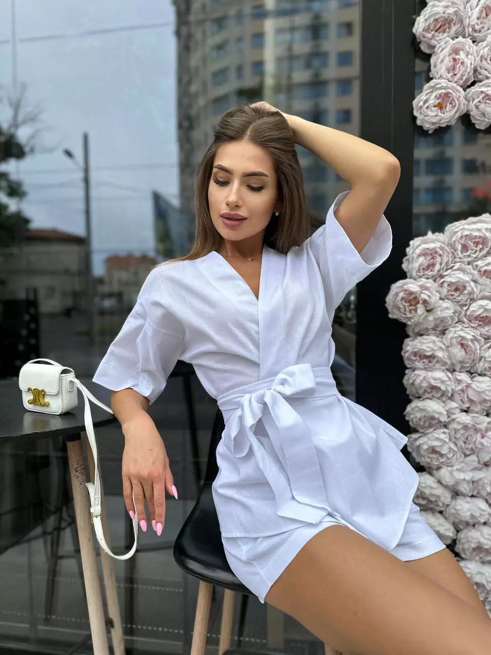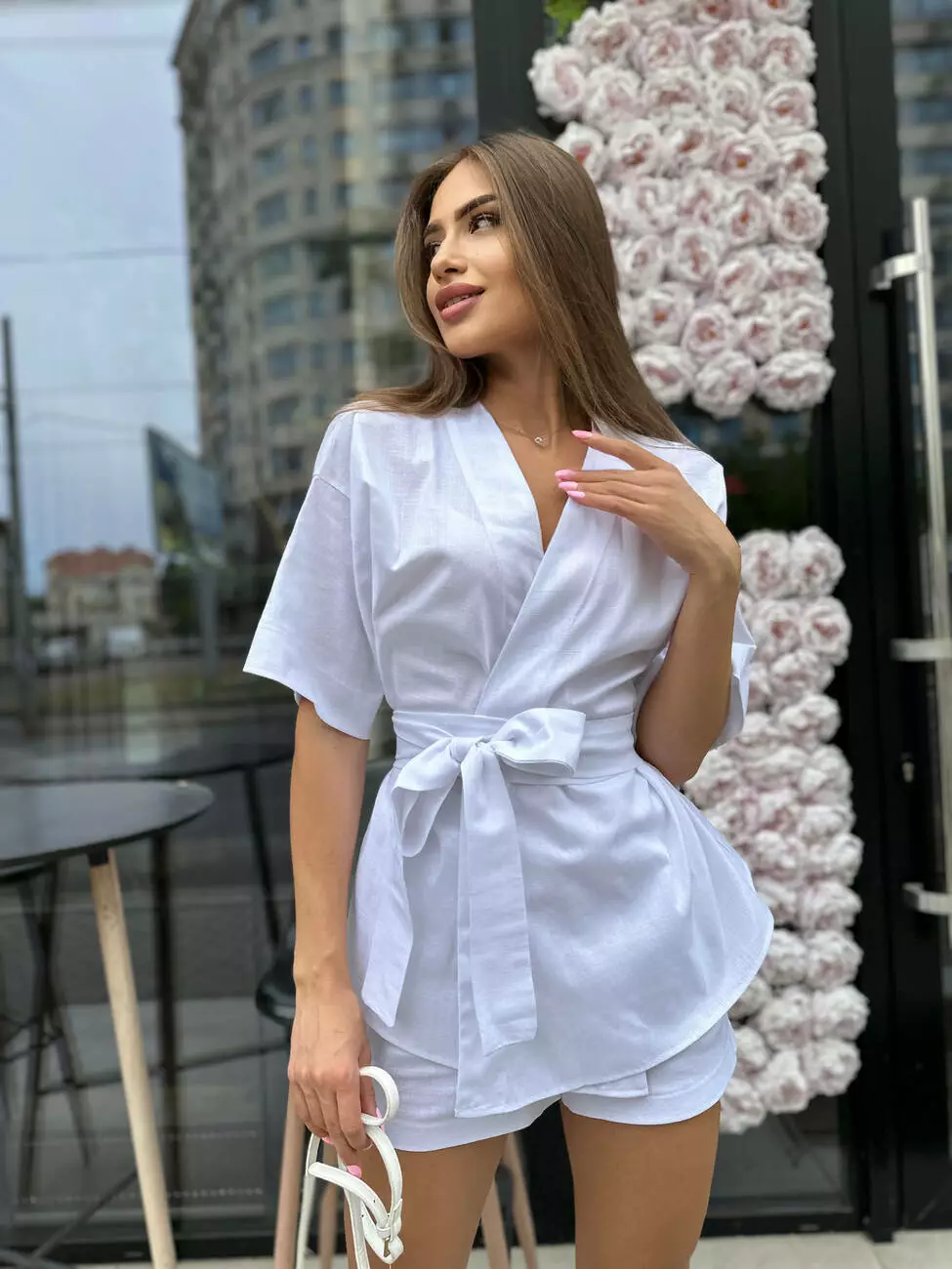 Стильний жіночий лляний костюм - кімоно та шорти.