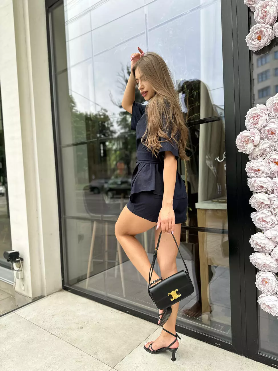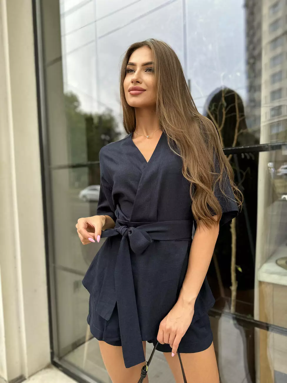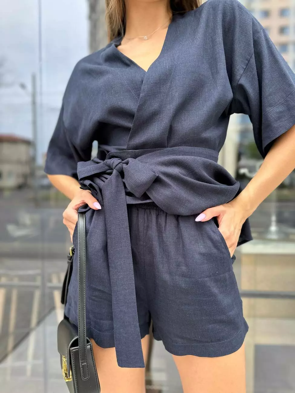 Стильний жіночий лляний костюм - кімоно та шорти.