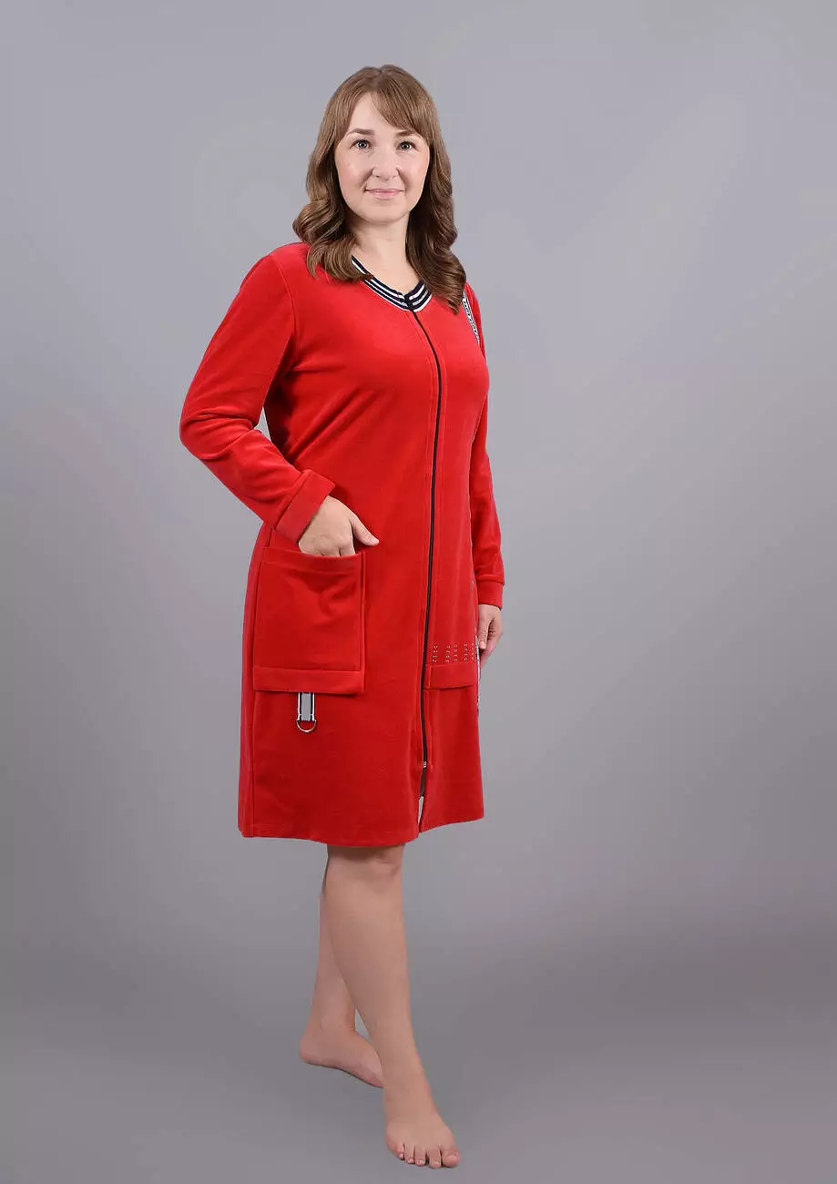 Про тканину: Бавовняний велюр - надзвичайно м'яка та приємна на дотик, матова трикотажна тканина. З лицьового боку з короткими ворсинками, з виворітного - гладка. Матеріал добре «дихає», гігієнічний. У складі тканини є еластан, завдяки йому тканина добре тягнеться і ідеально підходить для домашняго одягу.