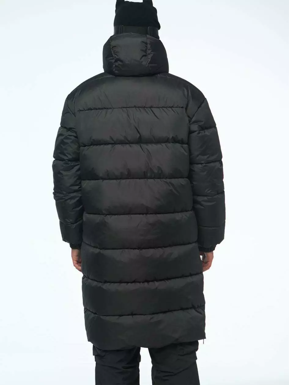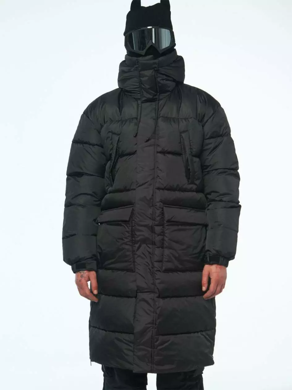 Довгий пуховик з об’ємним та глибоким капюшоном, який надійно