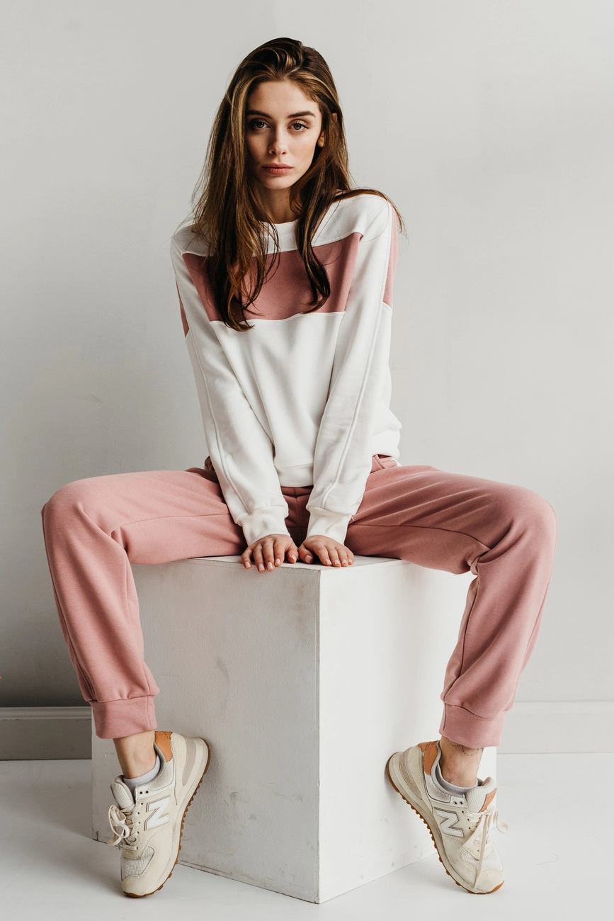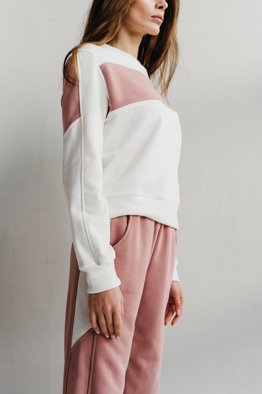 Теплий костюм із світшотом та штанами із високою посадкою талії на зручній резинці. Поєдання двох кольорів тканини із контрастними вставками.Розмір - роздріб - 44
