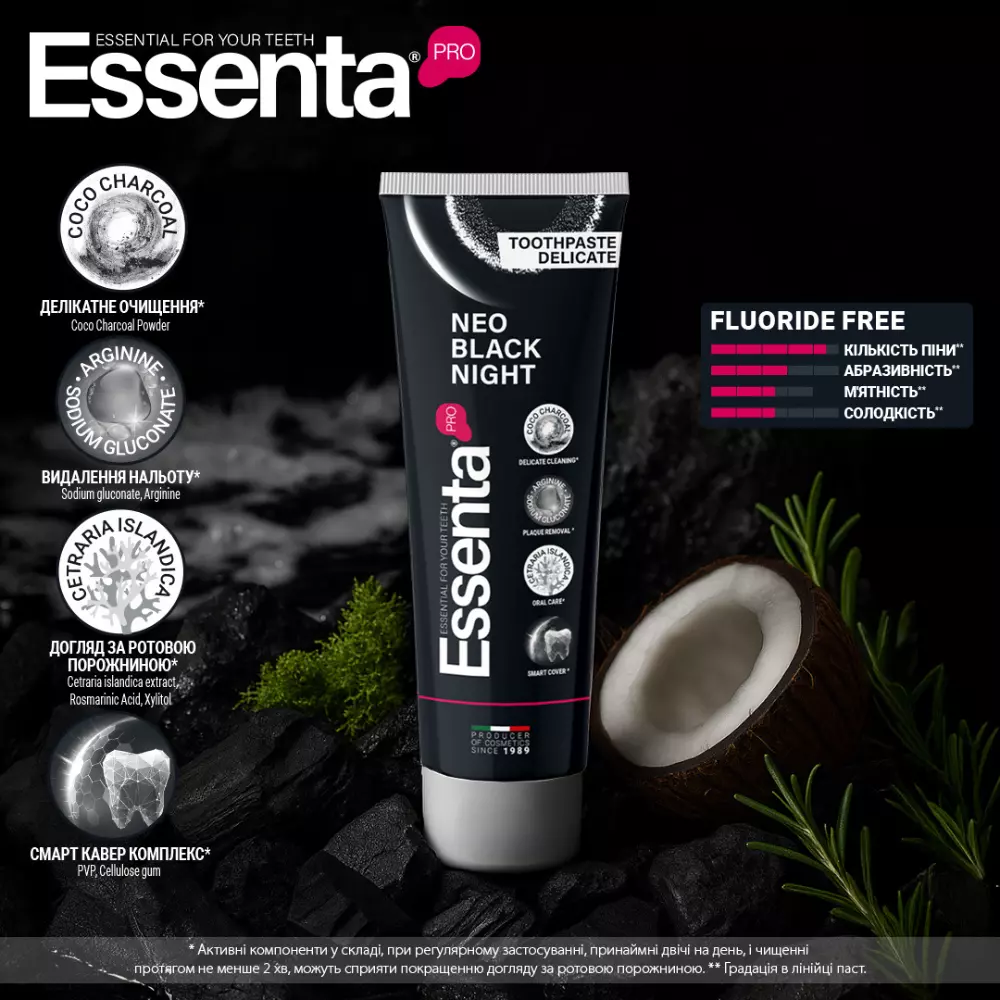 Формула для отбеливания зубов на основе мельчайших фракций натурального абразива – пудры кокосового угля (Charcoal powder). Зубная паста помогает удалять загрязнения с поверхности зубов, оставаясь щепетильной до зубной эмали.