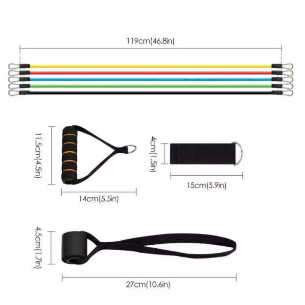 Эспандер резиновый трубчатый разной нагрузки с карабинами 5 шт х 1,2 м; ручки с неопреновым покрытием 2 шт; дверное крепление 1 шт.; чехол для хранения 1 шт.