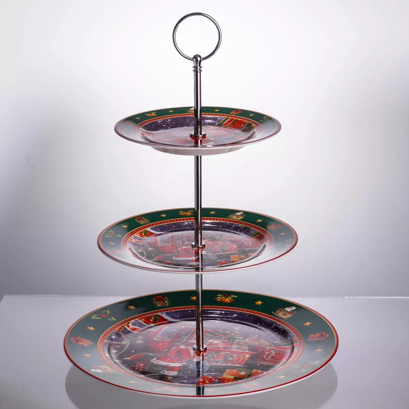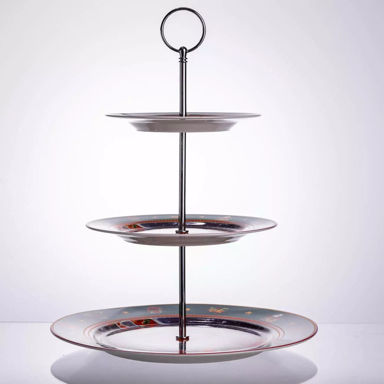 Елегантна триярусна етажерка з порцеляни - ідеальна прикраса для святкового столу та стильна підставка для десертів, печива та цукерок. Етажерка виконана із використанням різдвяних мотивів, що допомагає створювати атмосферу свята.