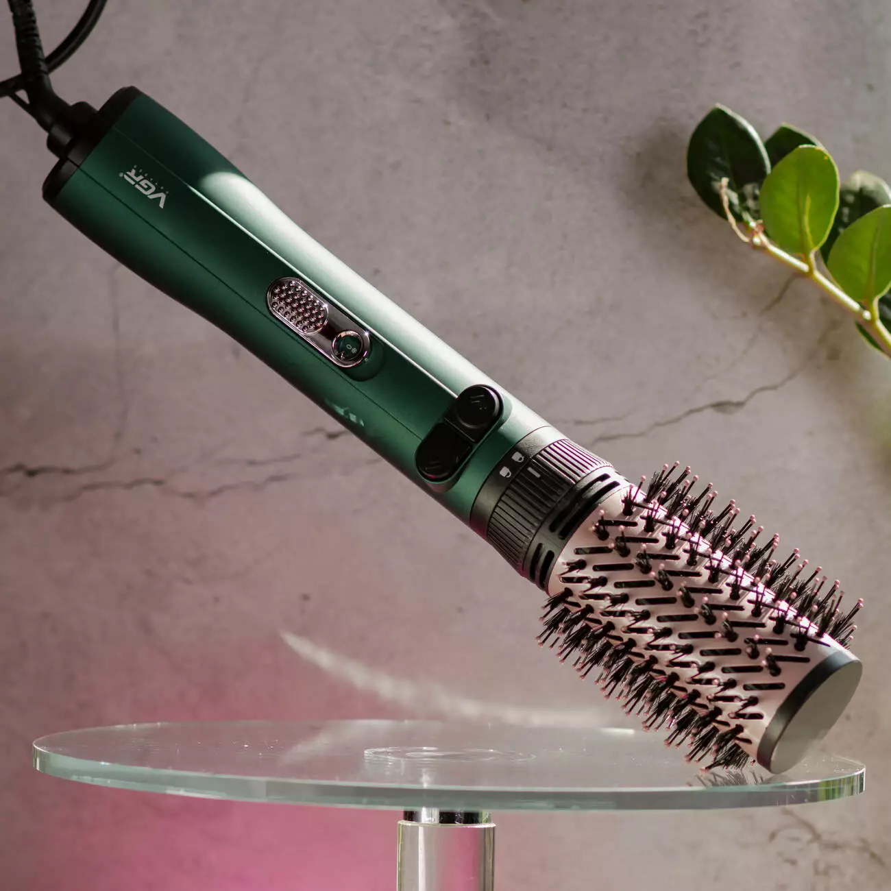 Фен щітка VGR V-498 — поєднує функції фена та щітки. З потужністю 1000-1200 Вт, цей прилад забезпечує ефективне сушіння та укладку волосся. Особливістю є функція обертання щітки вліво та вправо, що дозволяє з легкістю створювати як об'ємні, так і ідеально гладкі зачіски. Це ідеальний інструмент для тих, хто прагне швидких та професійних результатів у домашніх умовах.
