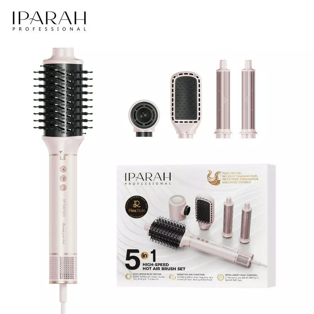 Багатофункціональний стайлер-фен IPARAH P-505 5-в-1 Multi-Styler With Hot Air Brush - це універсальний прилад для створення різноманітних зачісок та укладання волосся. Він поєднує функції фена, щітки-стайлера, випрямляча і двох насадок для завивки, дозволяючи сушити, випрямляти, формувати локони і надавати об'єм з одним пристроєм. Безщітковий мотор BLDC забезпечує потужний повітряний потік і високу швидкість обертання (≈105 000 об/хв), що скорочує час сушіння та допомагає досягти професійних результатів. Регульовані рівні температури і швидкості обдування дозволяють підібрати оптимальні параметри під різні типи волосся, а технологія іонізації робить волосся гладкішим і зменшує статичну електрику. Комплект включає 5 змінних насадок, завдяки яким можна легко змінювати стилі та створювати зачіски різної складності.