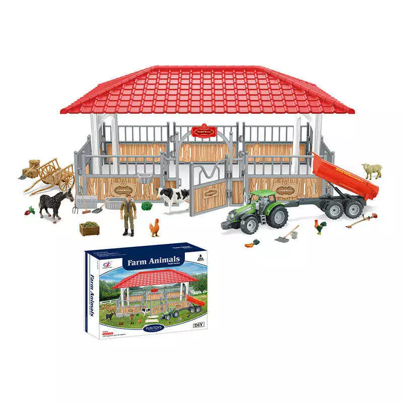 Ферма Q 9899 ZJ95 (8) 63 елементи, хлів, трактор, інерція, причіп, фігурка з рухливими руками, тварини, повозка, овочі, інструменти, в коробці