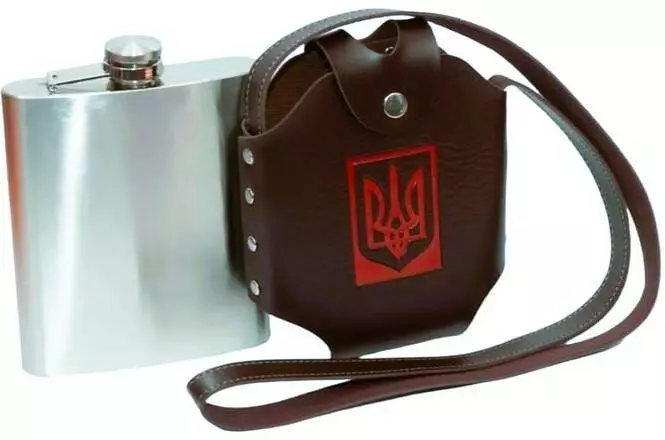 Фляга объёмом 48 oz (≈1,4 л) из нержавеющей стали в комплекте с кожаным чехлом чёрного цвета с тиснением герба Украины (тризуб). Чехол оснащён прочным ремнём для ношения через плечо, что делает аксессуар максимально удобным для походов, рыбалки, охоты и активного отдыха.