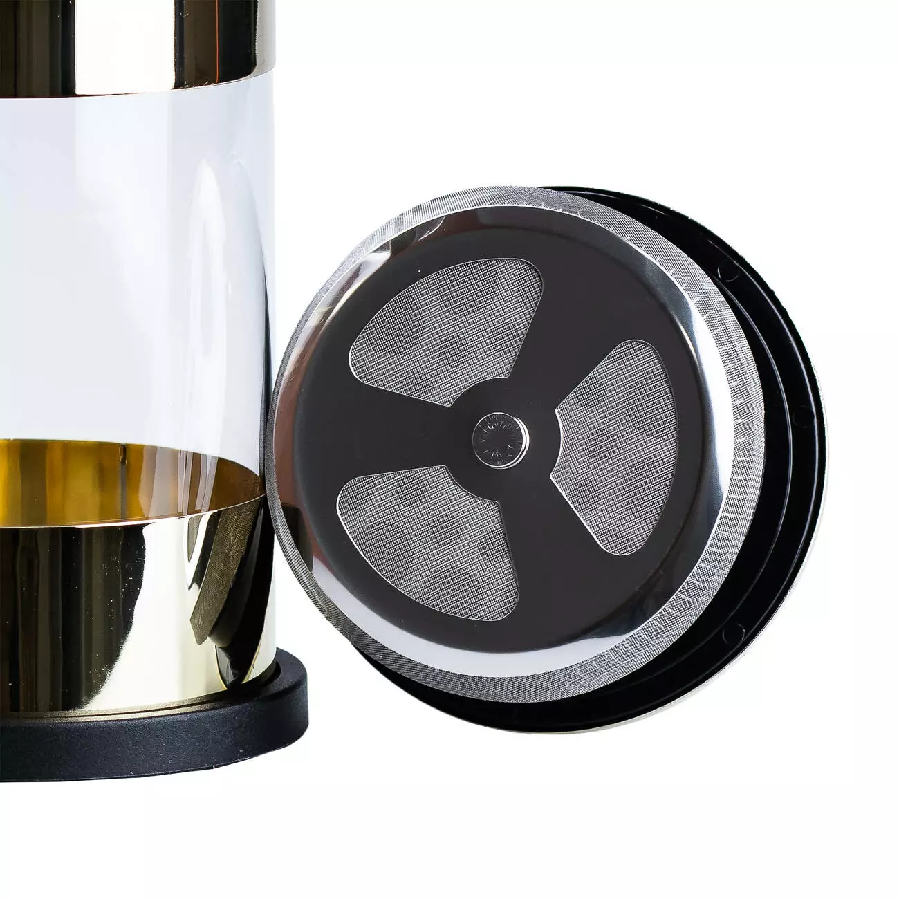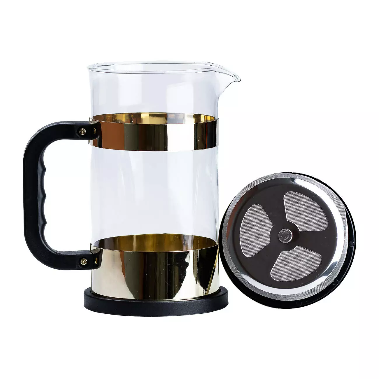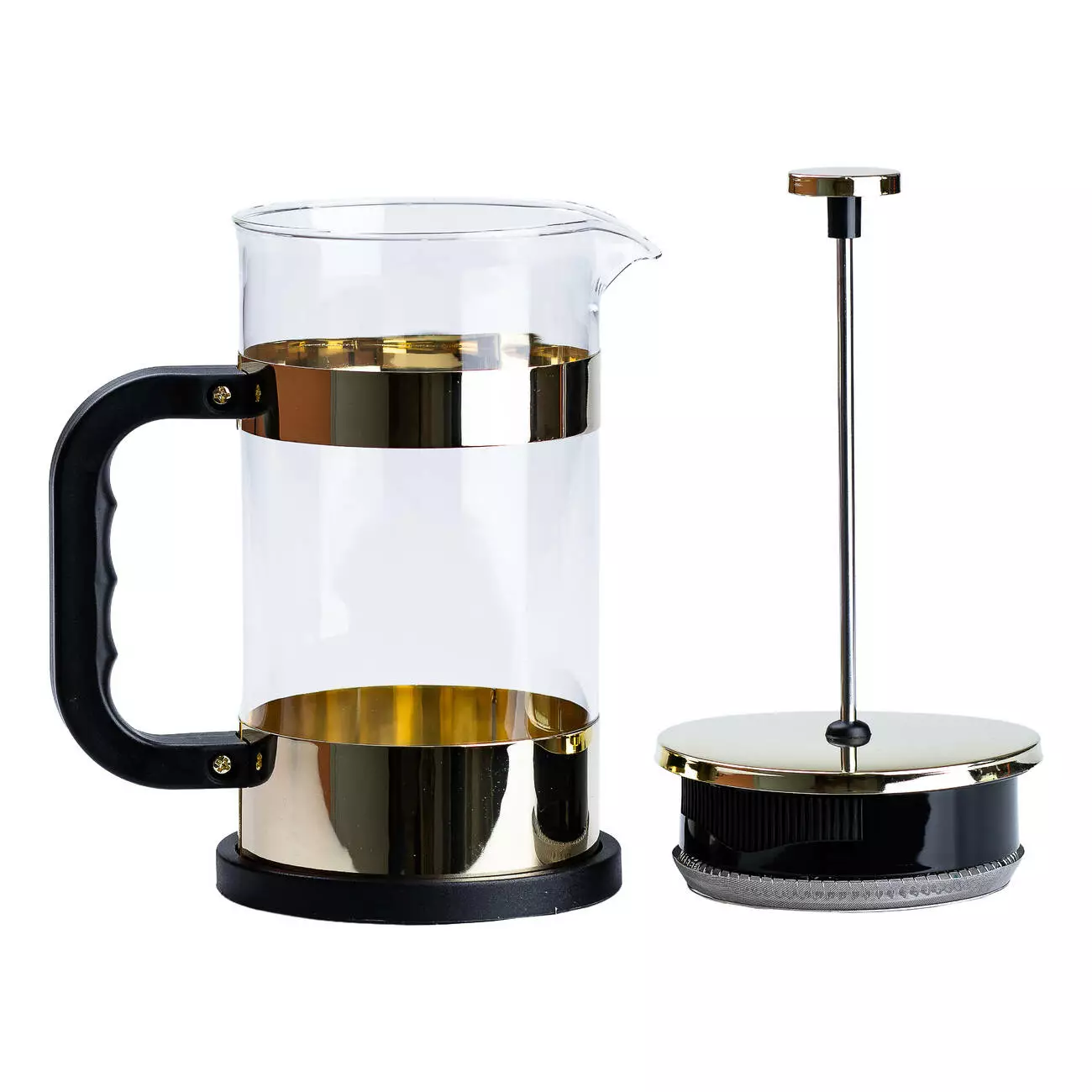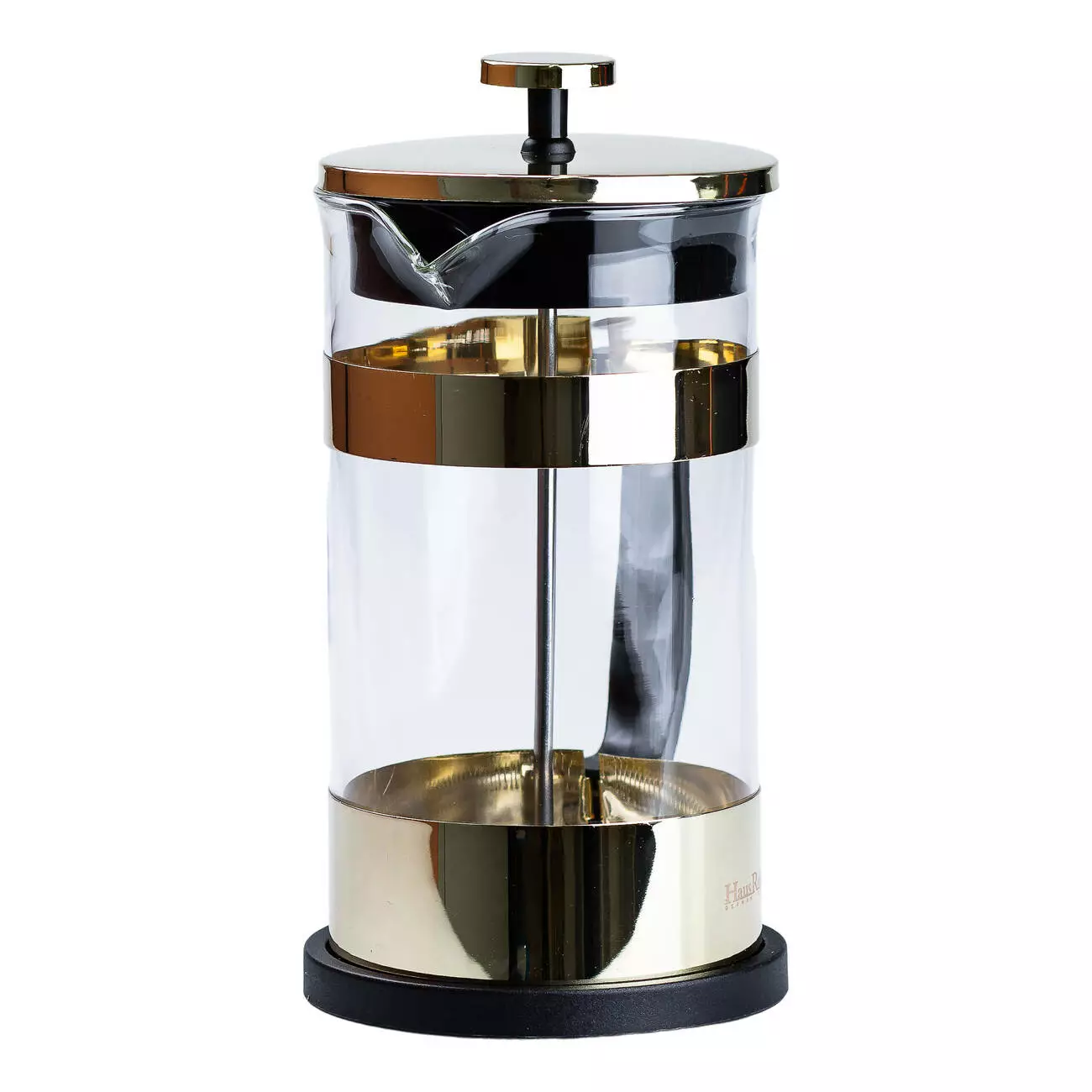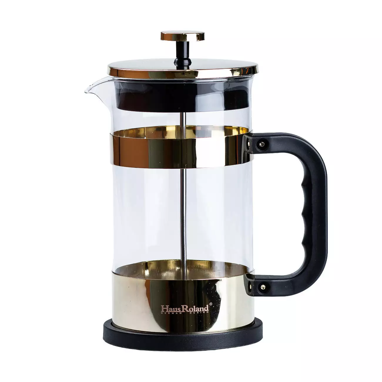 Цей елегантний френч-прес Haus Roland об'ємом 1 л вишукано доповнить вашу кухню. Колба з високоякісного скла стійка до перепадів температур і легко миється, а золота окантовка надає їй елегантності. Фільтр з нержавіючої сталі щільно прилягає, забезпечуючи чисте заварювання кави або чаю.